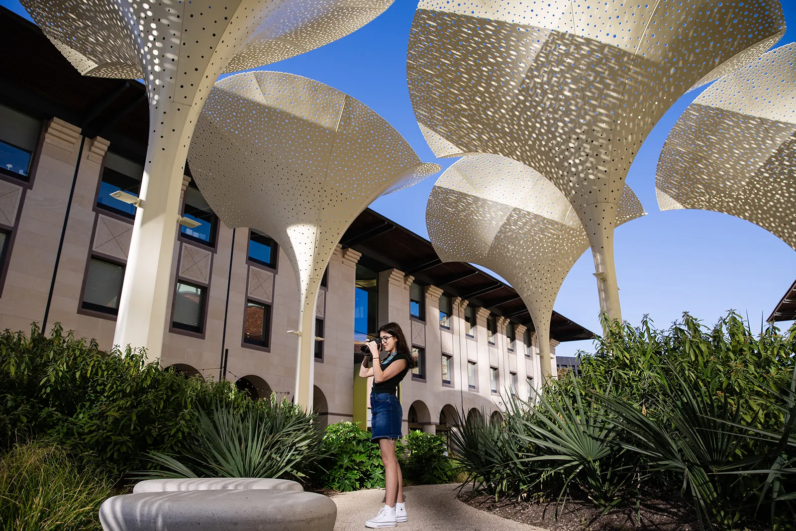 Nia Botti is surrounded by larger than life sculptures as she takes a photo outside the Blanton Museum of Art in Austin, Texas, on Friday, Jan. 24, 2025. Botti will be featured in the university's Spring 2025 magazine.