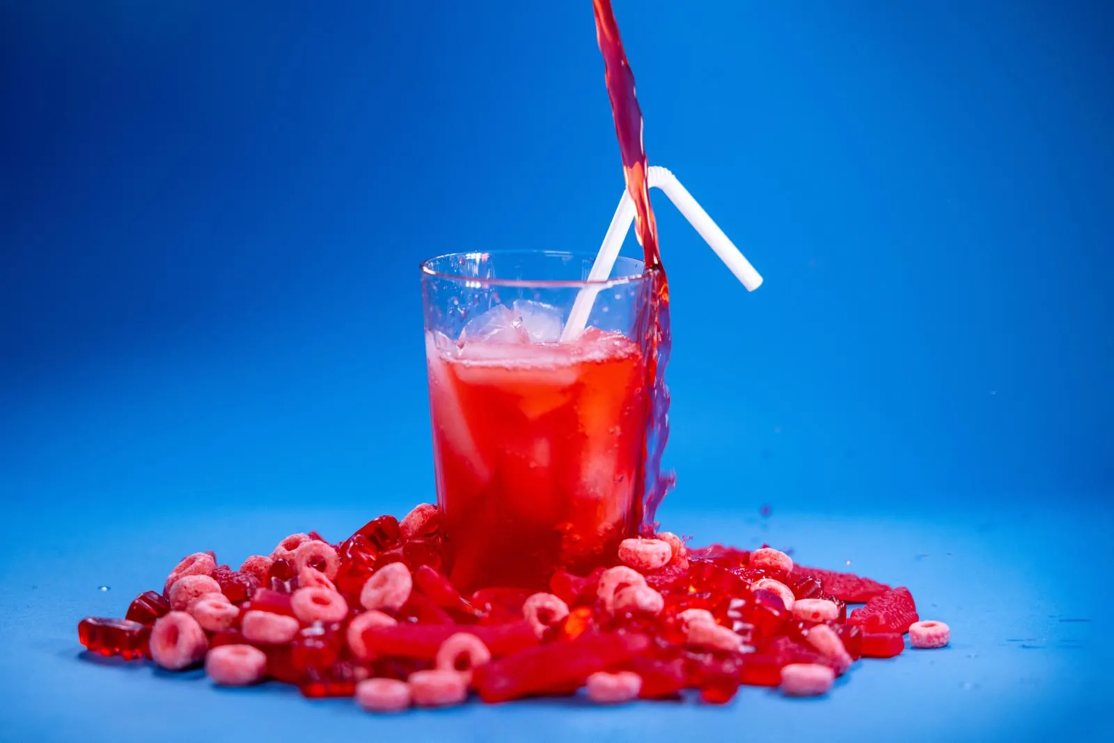Why is red dye such a popular color in sugary foods? An ASU professor explains why. A glass of Hawaiian punch sits in a mound of red fruit loops, Swedish fish and gummy bears to accompany the story.