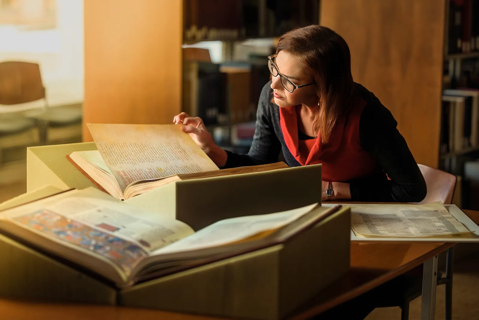 Atria A. Larson, Ph.D., Associate Professor of Medieval Christianity, studies illuminated manuscripts.