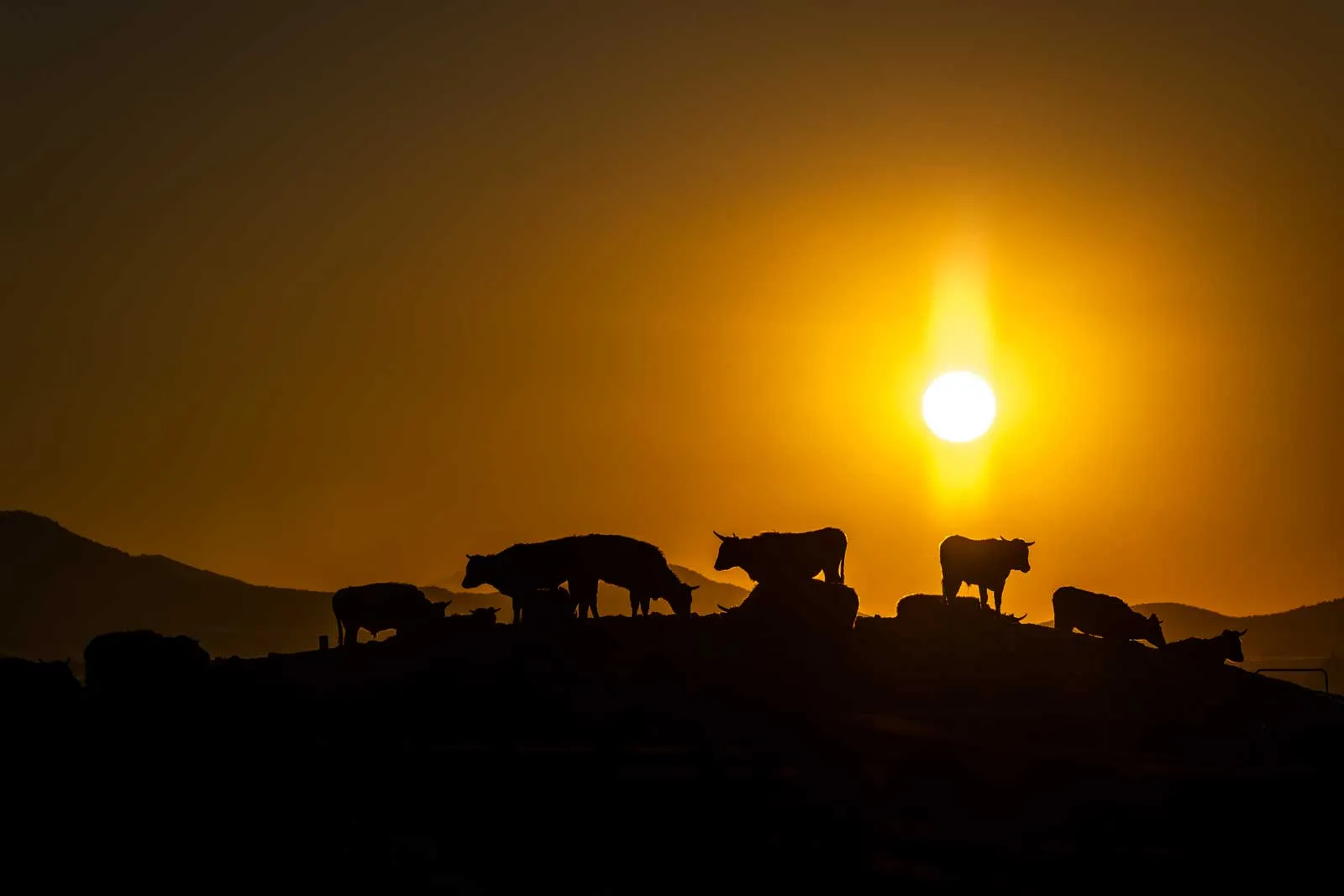 Beef cattle roam on top of a mound as the sun sets.