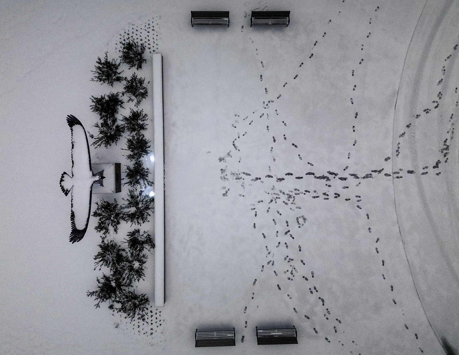 A trail of footprints in the snow lead to and from the iconic Seahawk sculpture on the campus of UNCW. A winter storm covered the campus in a blanket of snow Wednesday, January 22, 2025.