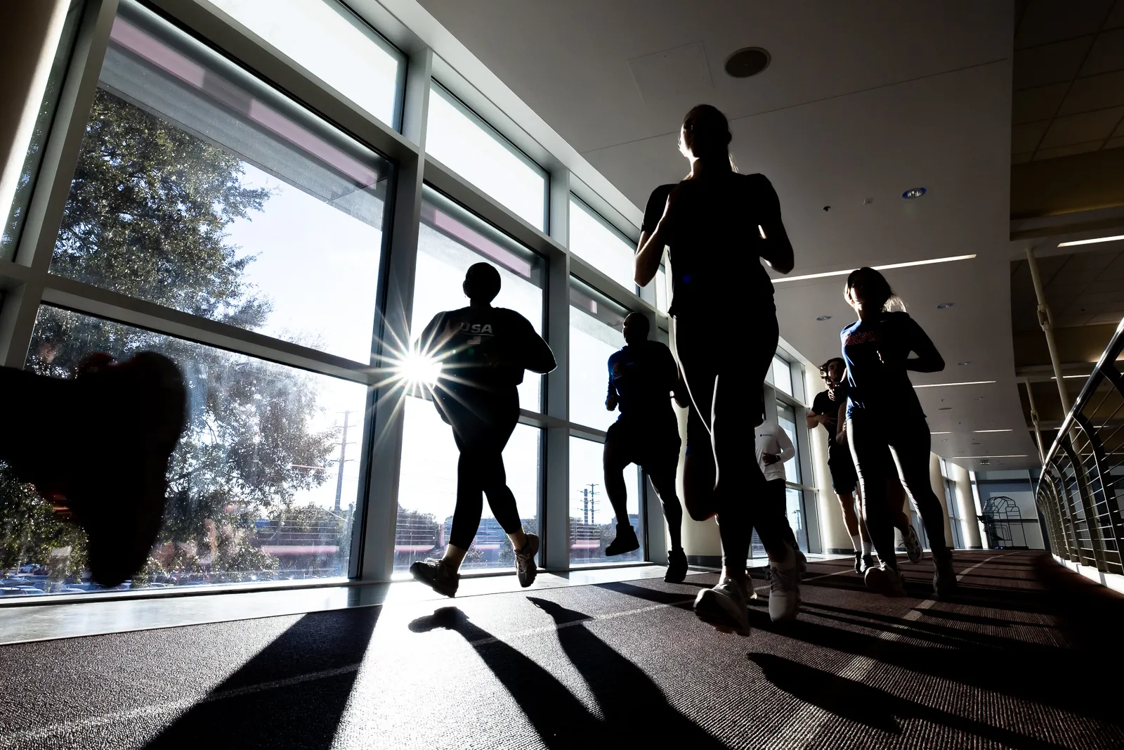 RecSports group fitness instructors run on the indoor track as part of a group fitness promotional photoshoot on Thursday, January 16, 2025.