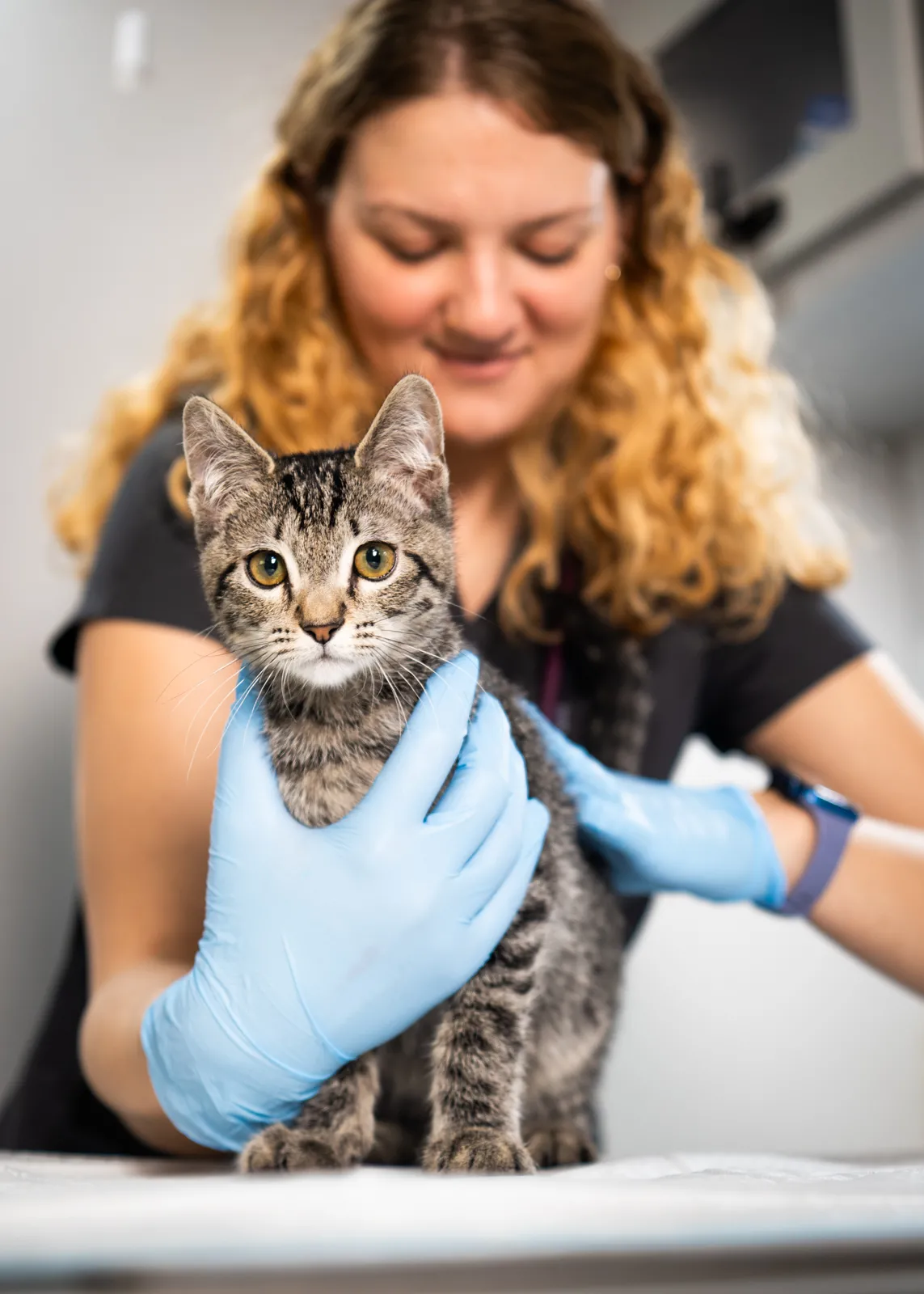 A kitten receives an exam (and lots of love,) from MSU Vet Med student, Camryn Carlson, inside the College of Veterinary Medicine's mobile clinic.