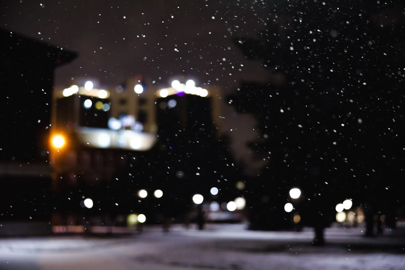 This photo was shot during a snowstorm in early January. I ended up taking intentionally blurry photos on our campus so the viewer could make out our landmark housing building by the blurry lights. I could not quite get the snow in frame, so I shot the snow close to a sidewalk light, and added as a separate layer in Photoshop.