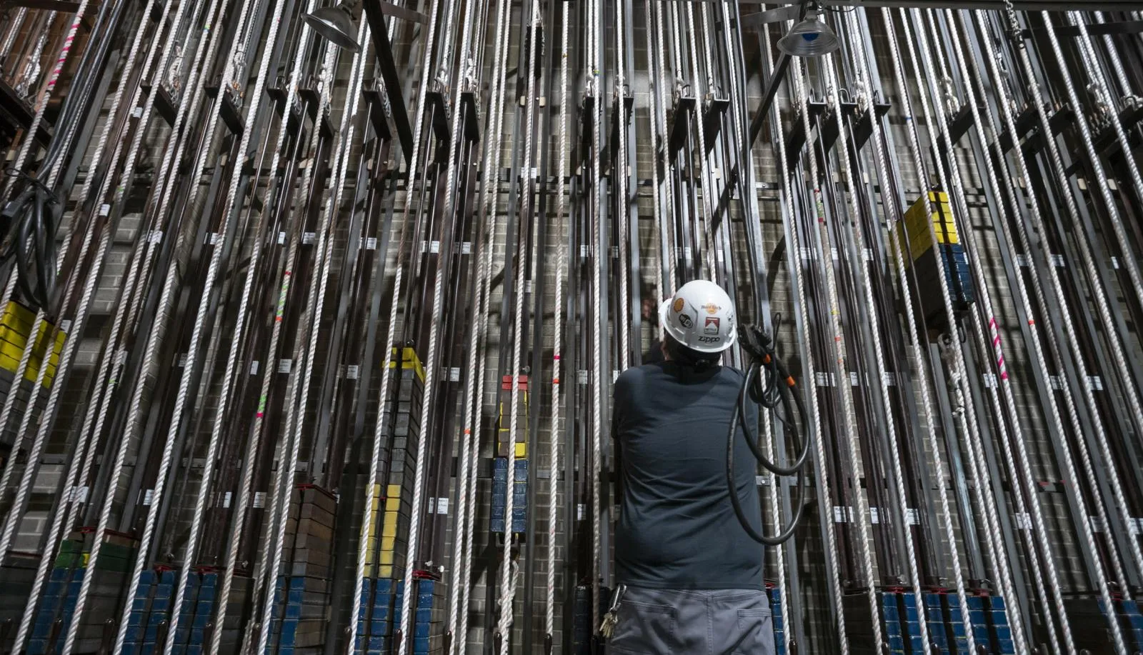Jason Gates, a theatre technician, counterbalances moving set pieces along the side wall of a theatre. The cables stretch 60 feet up into the ceiling and can counterweigh 2,000 pound set pieces.
