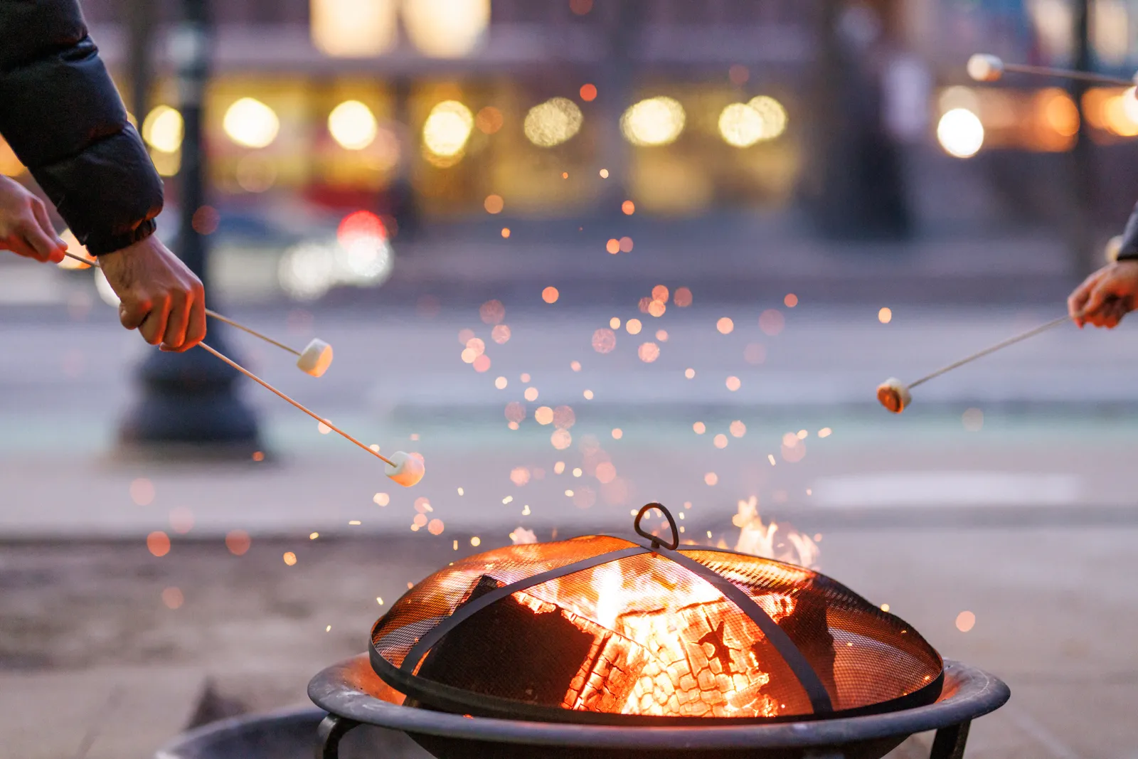 A detail of students roasting marshmallows at at a campus event on Tuesday, January 28, 2025. Generative Fill in Photoshop was used to remove a vehicle in the background of this image behind the fire. The sparks from the fire were real and photographed in-camera.