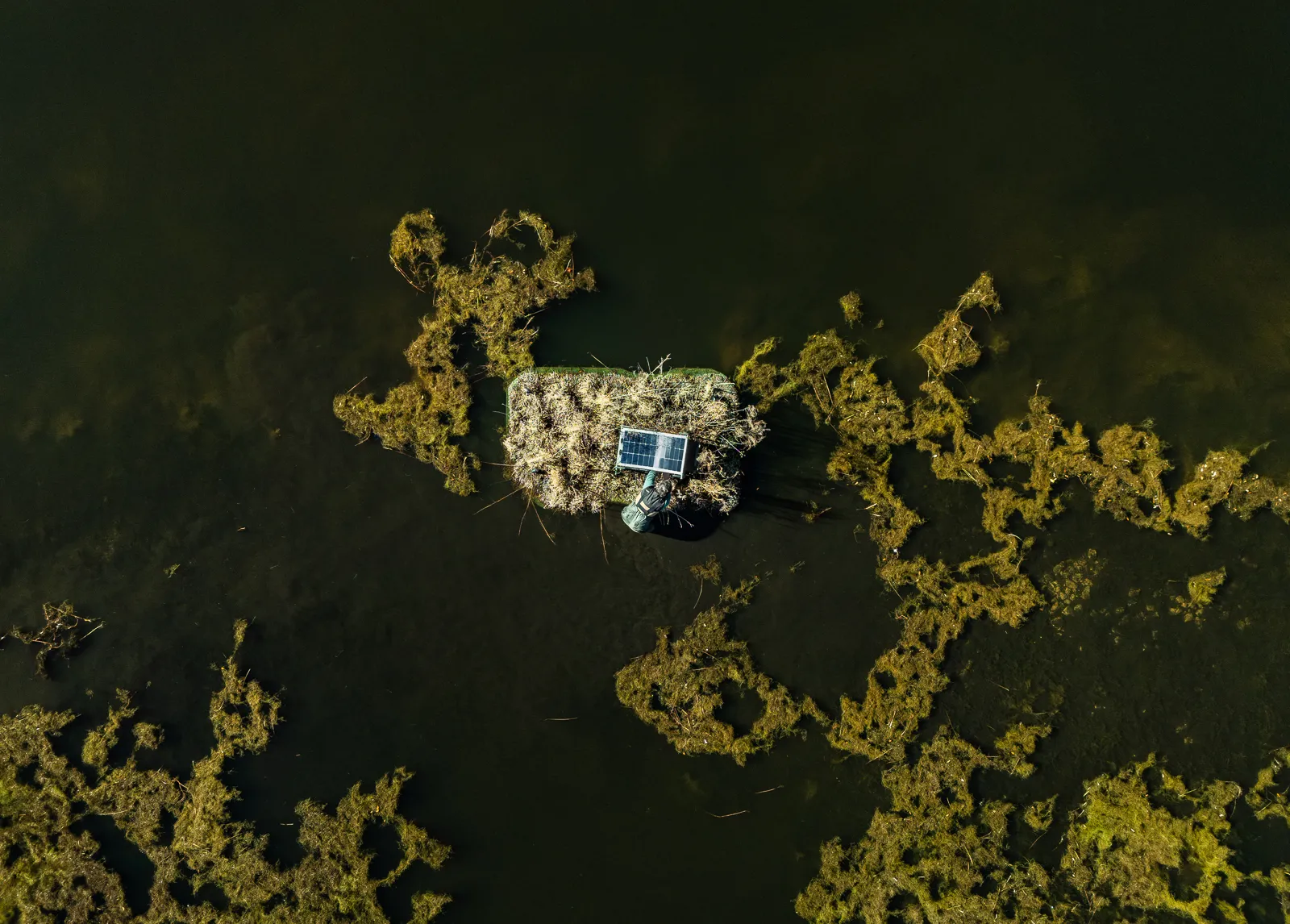 UNCW art professor Gene A. Felice II changes out sensors in his floating island retention pond art/science collaboration project at the Cameron Art Museum on January 30, 2025.