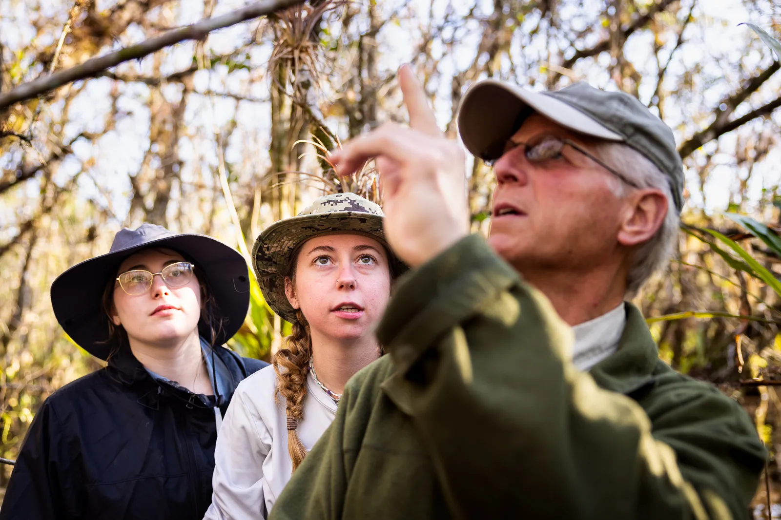 Molly Majewski (left) and Maya Lasker listen as Sandy Geffner answers their questions while hiking in the Florida Everglades in January 2025.