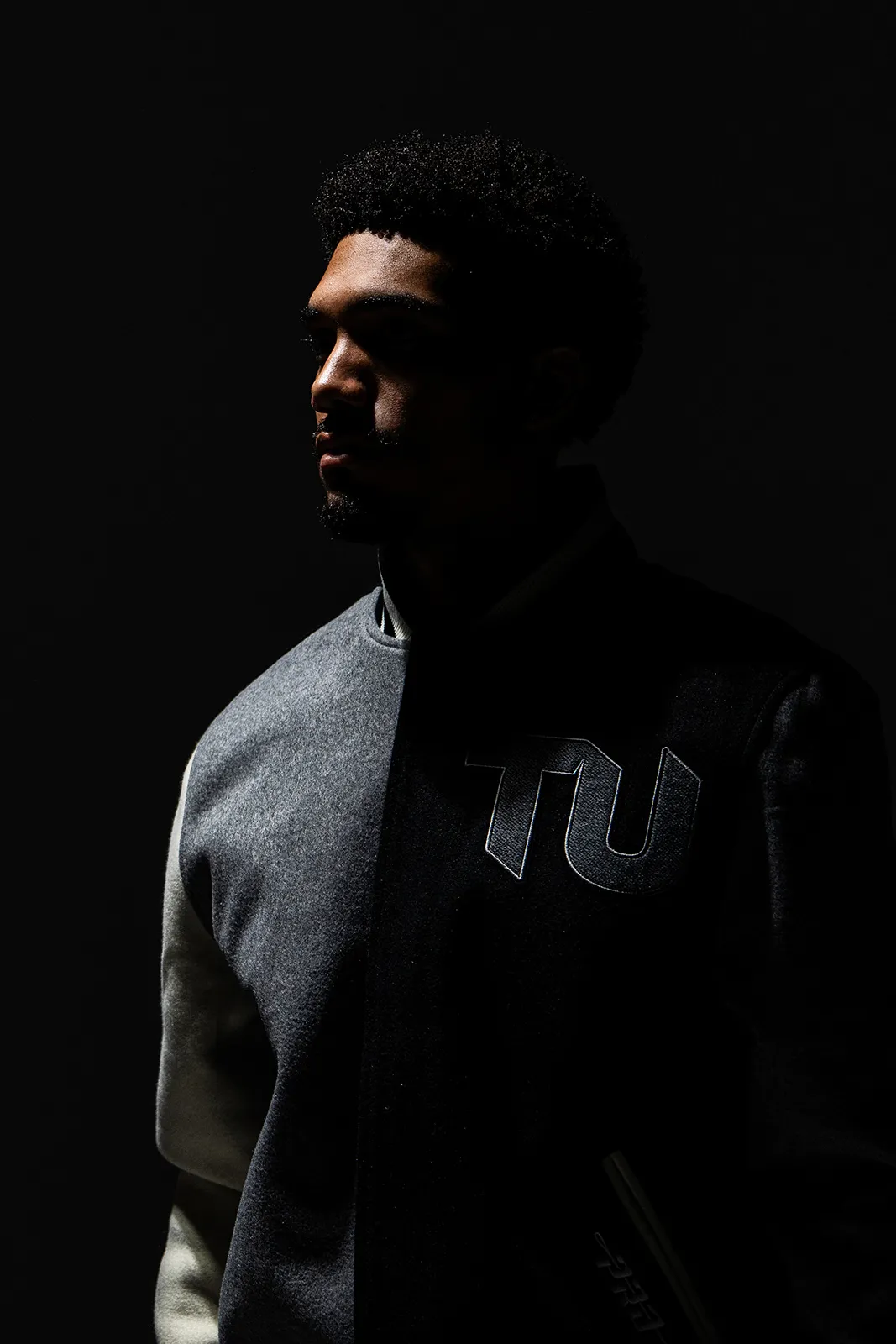 A student poses wearing the Studio '66 fashion line of University apparel for a marketing campaign promoting its release.