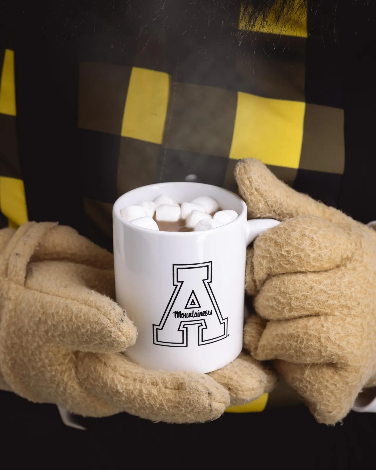 App State Mascot, Yosef, enjoys a warm cup of hot cocoa.