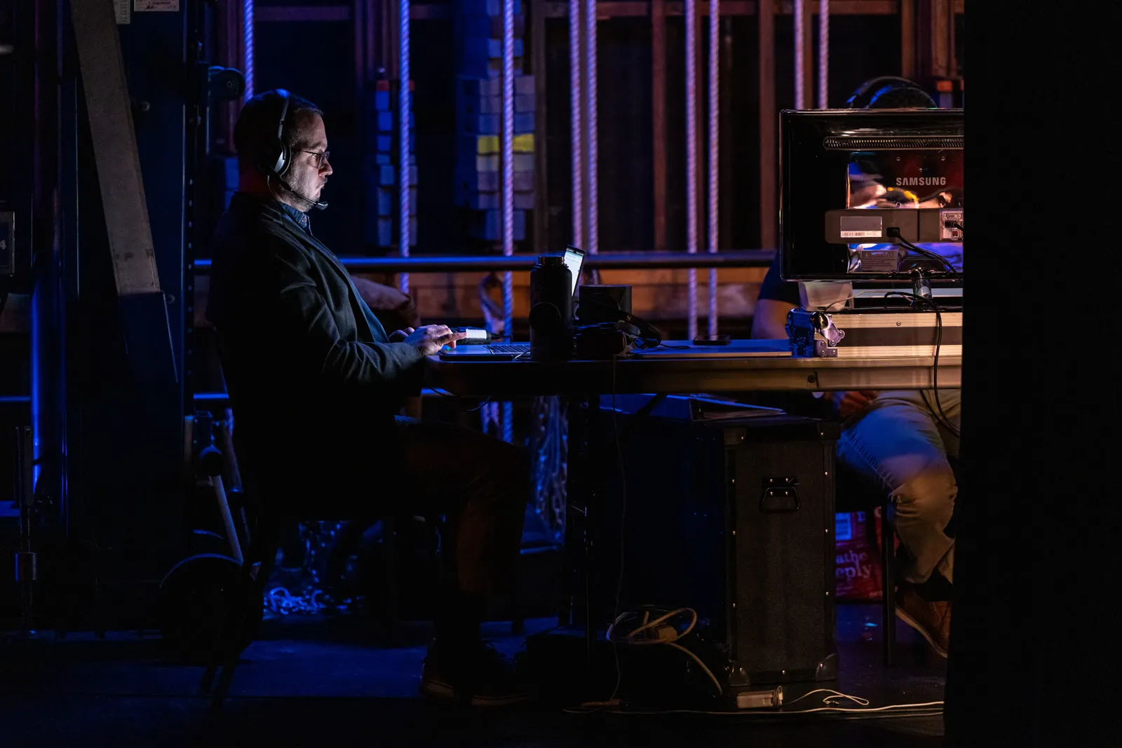 Always needing BTS shots, this is backstage at commencement as the live event producers with Mizzou Visual Productions make sure the program and live stream go on without a hitch.