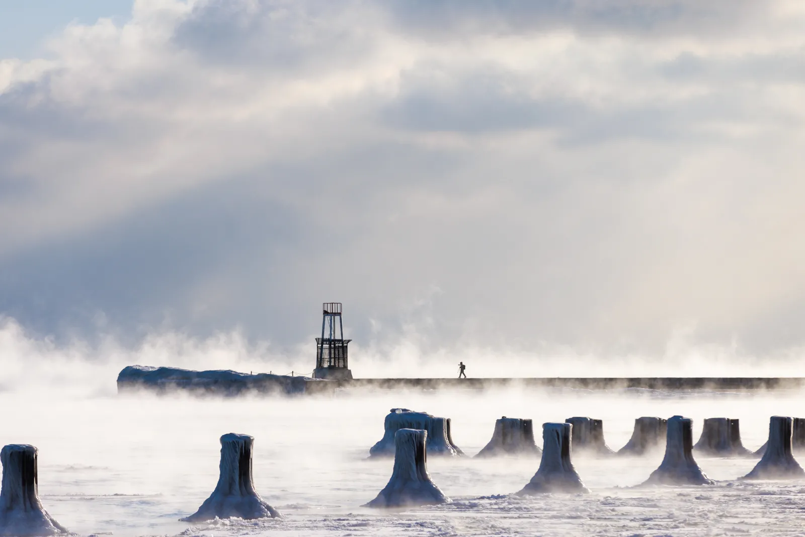 A person is silhouetted in cold steam from Lake Michigan on North Ave Beach in Chicago on Tuesday, January 21, 2025. The temperature is -4 degrees fahrenheit with a wind chill of -19 degrees.