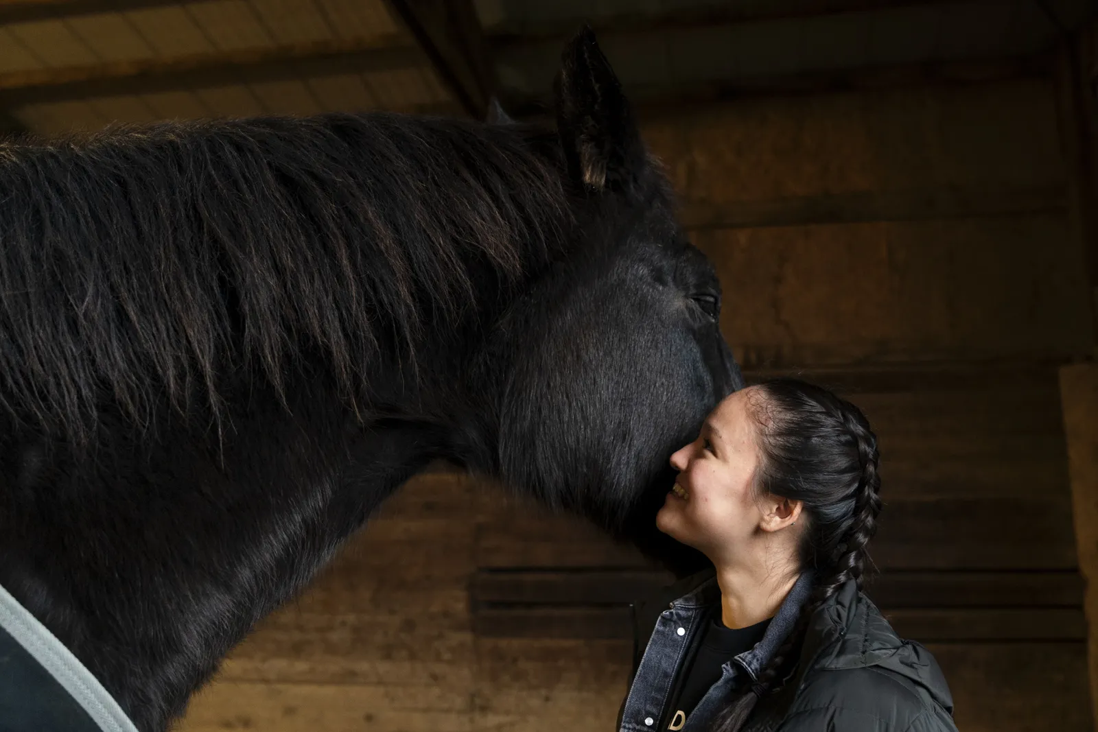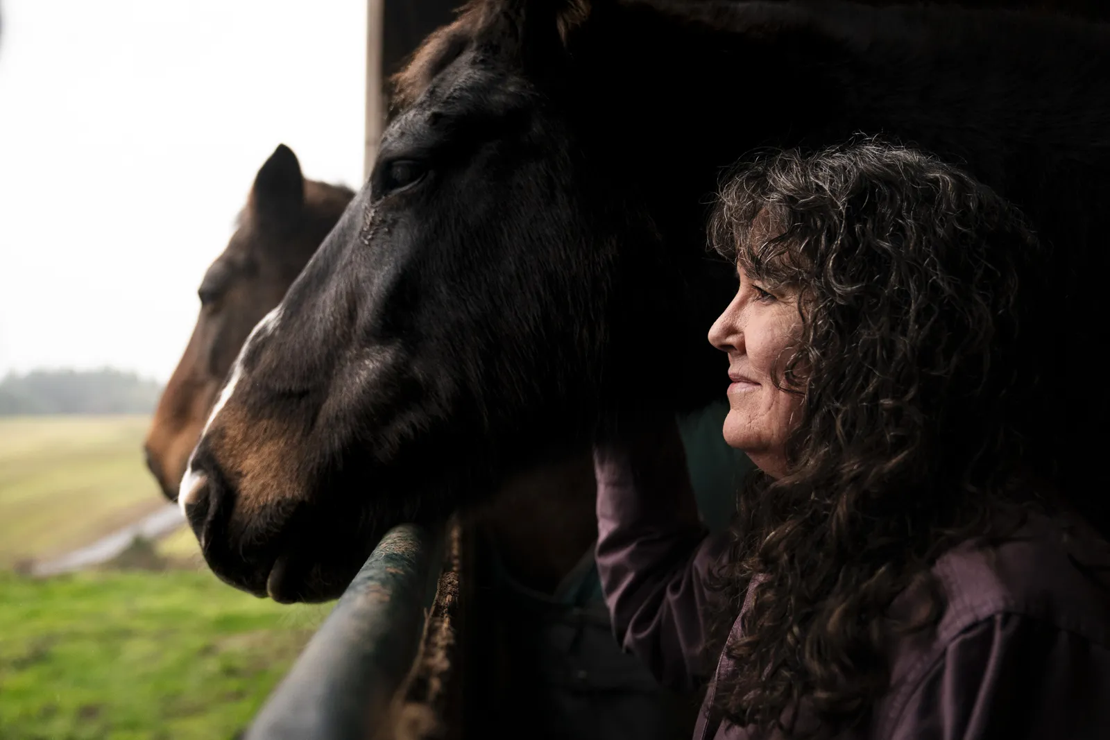 Woman stands by a horse in a quiet moment before a therapy session with a client.