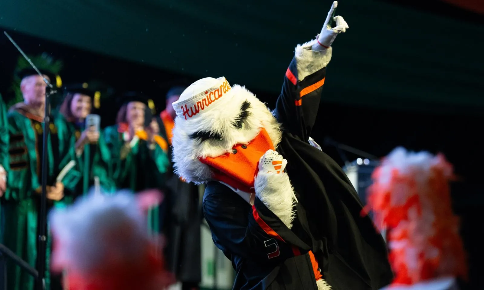 University of Miami Mascot Sebastian the Ibis dancing on stage during the Fall 2024 Commencement Ceremony.