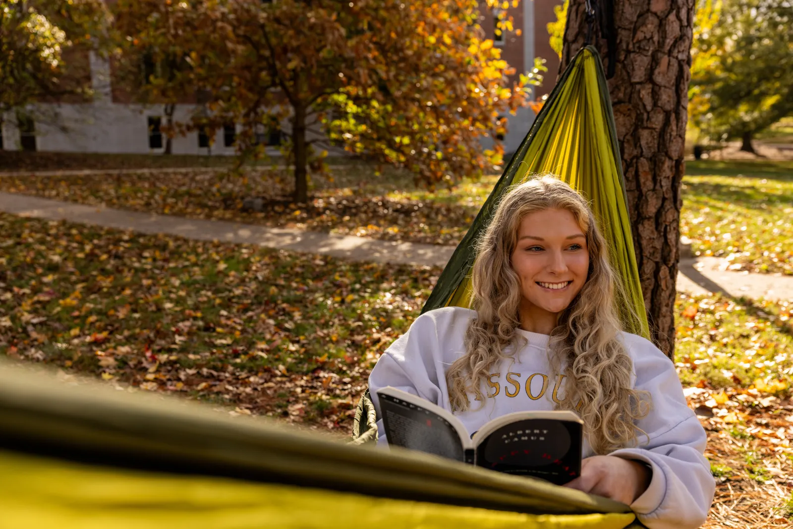 "English major" reading in a hammock for the College of Arts & Science student marketing photoshoot.