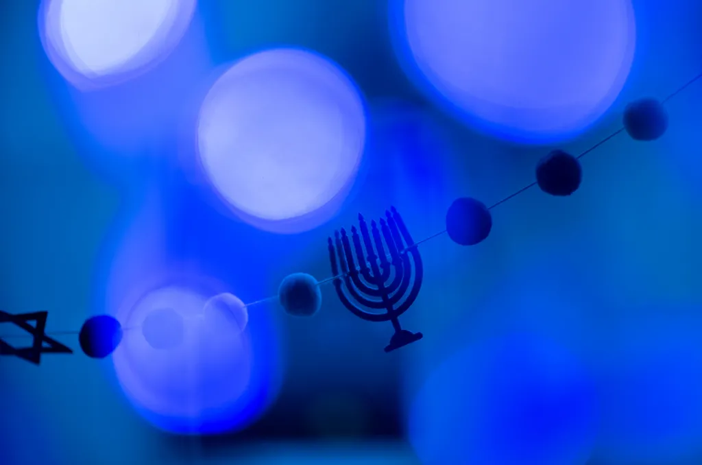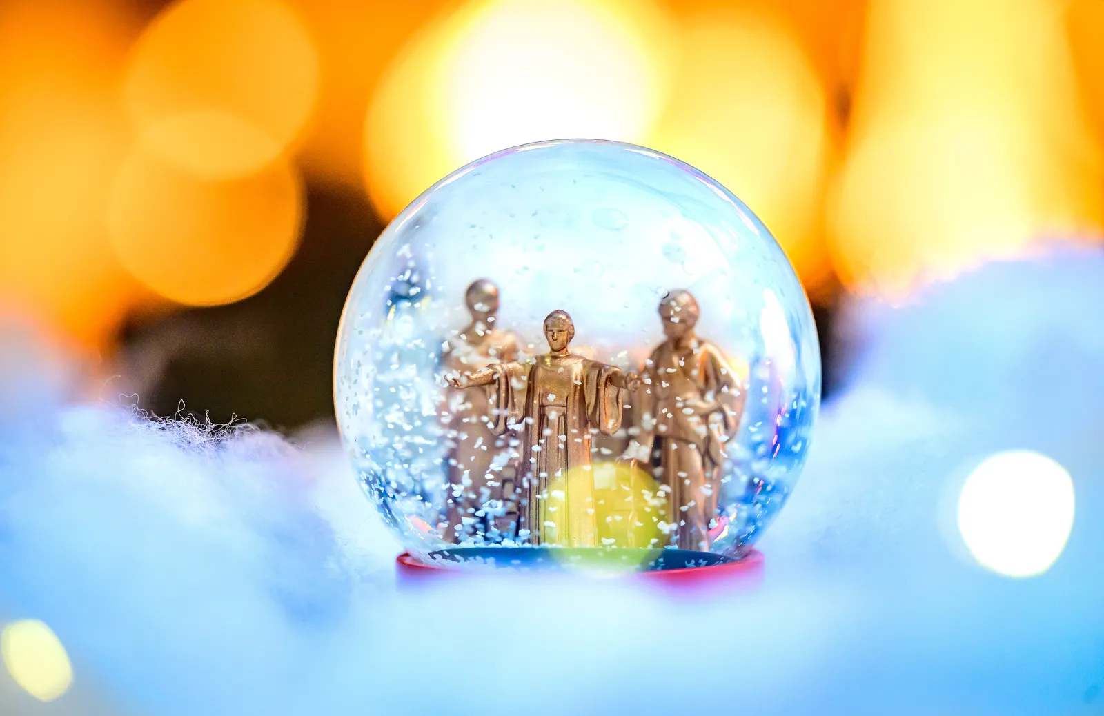 Image created for university holiday messaging: An Alma Mater miniature statue scaled for a snow globe nestled in a blanket of cotton snow with an actual fire burning in the background.