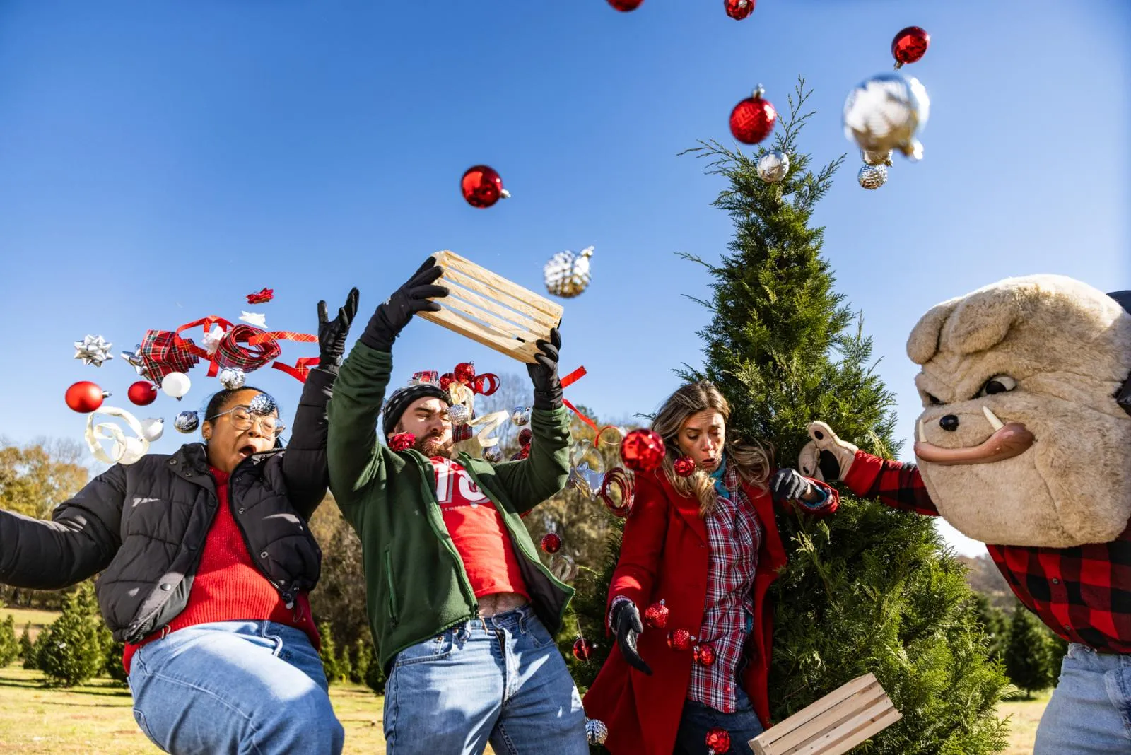 Behind the scenes still from a holiday marketing video shoot featuring mascot Hairy Dawg at a local Christmas tree farm in the style of a Hallmark movie.