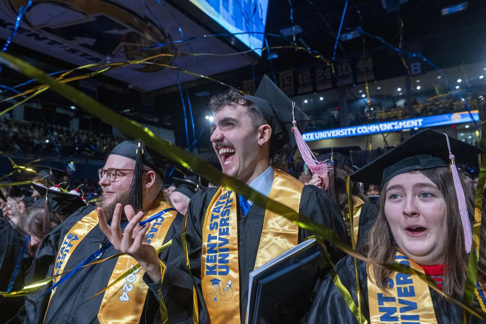 In what has become a university tradition, confetti and streamers are blasted at the graduating seniors following commencement.