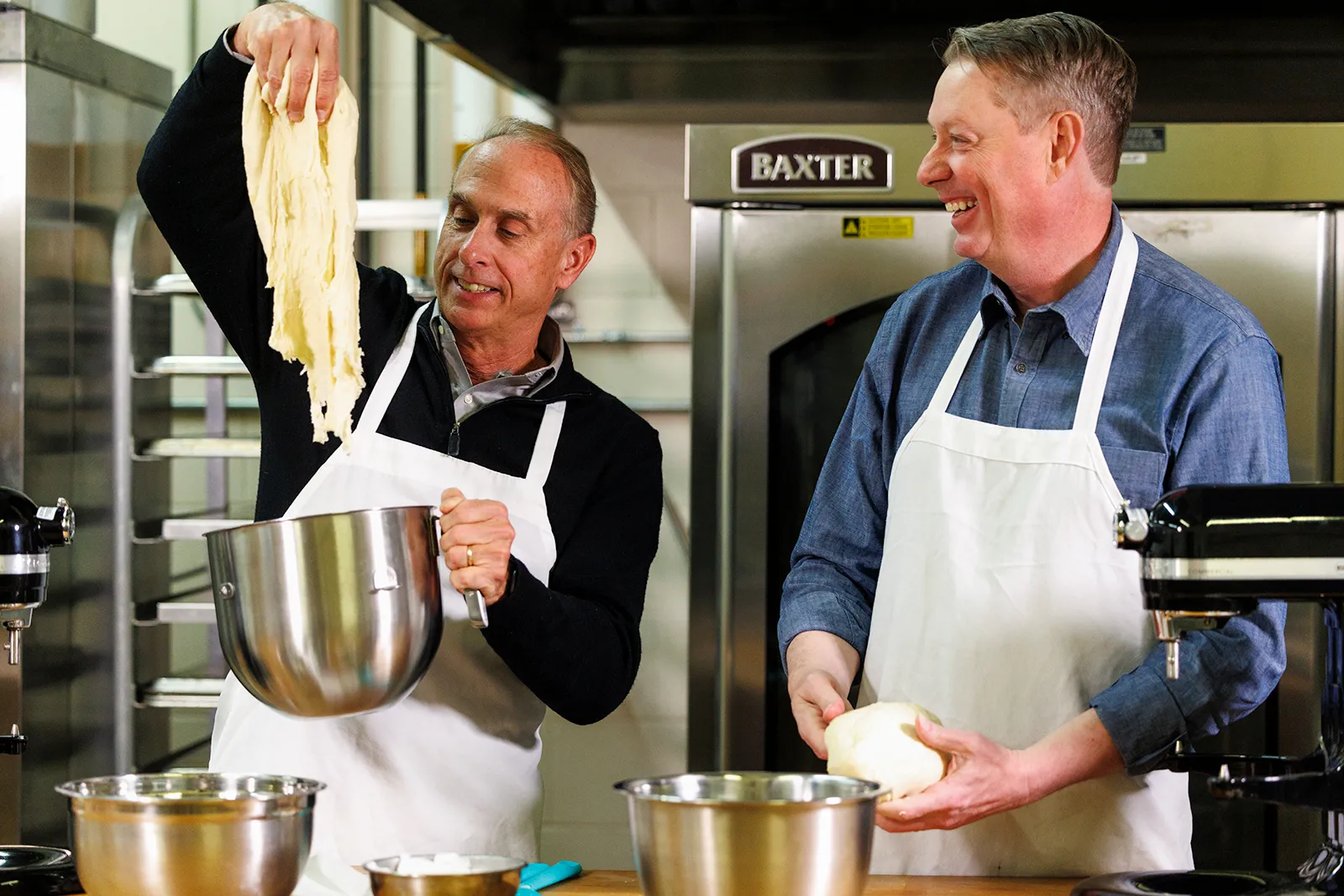 Vice President and Dean of Agriculture Jayson Lusk (R) and Dr. Brett Carver (L) have a conversation as they make bread for a film in the Food and Agricultural Products Center on Thursday, Dec. 12, 2024.