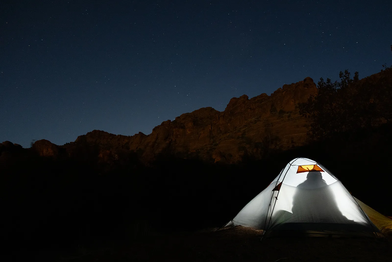 Business major Sasha Elle poses for a photo inside of her tent at the Red Cliffs Campground to go climbing during an Outdoor Adventures climbing and camping trip in Hurricane on Saturday, November 16, 2024.