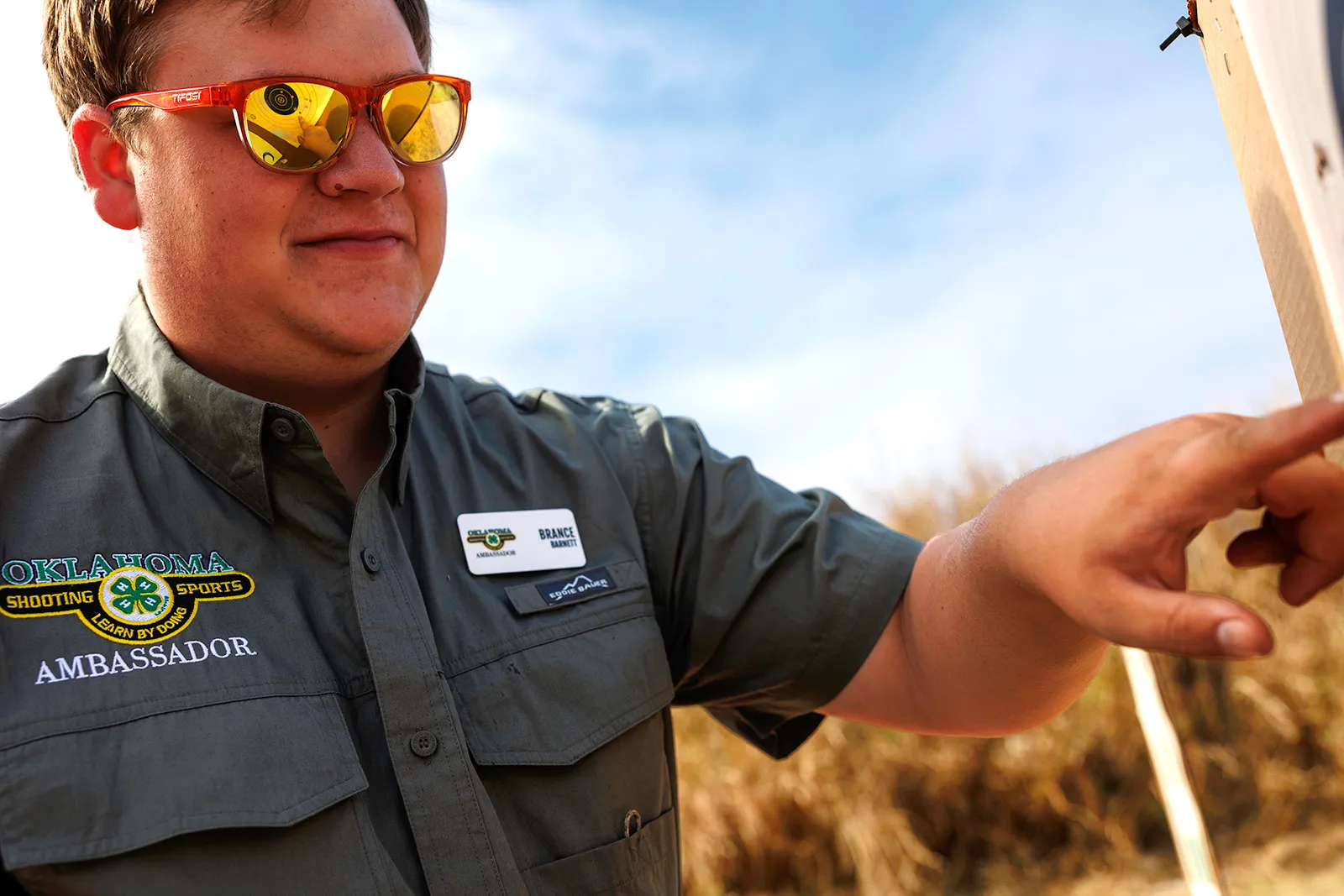 Brance Barnett, an Oklahoma 4H Shooting Ambassador, points at tallies the score of a musket loader shooting round. Oklahoma 4-H has various shooting sports, and it is the ambassador's job to spread awareness. I was asked to photograph shooting sports, without showing the tools they use.