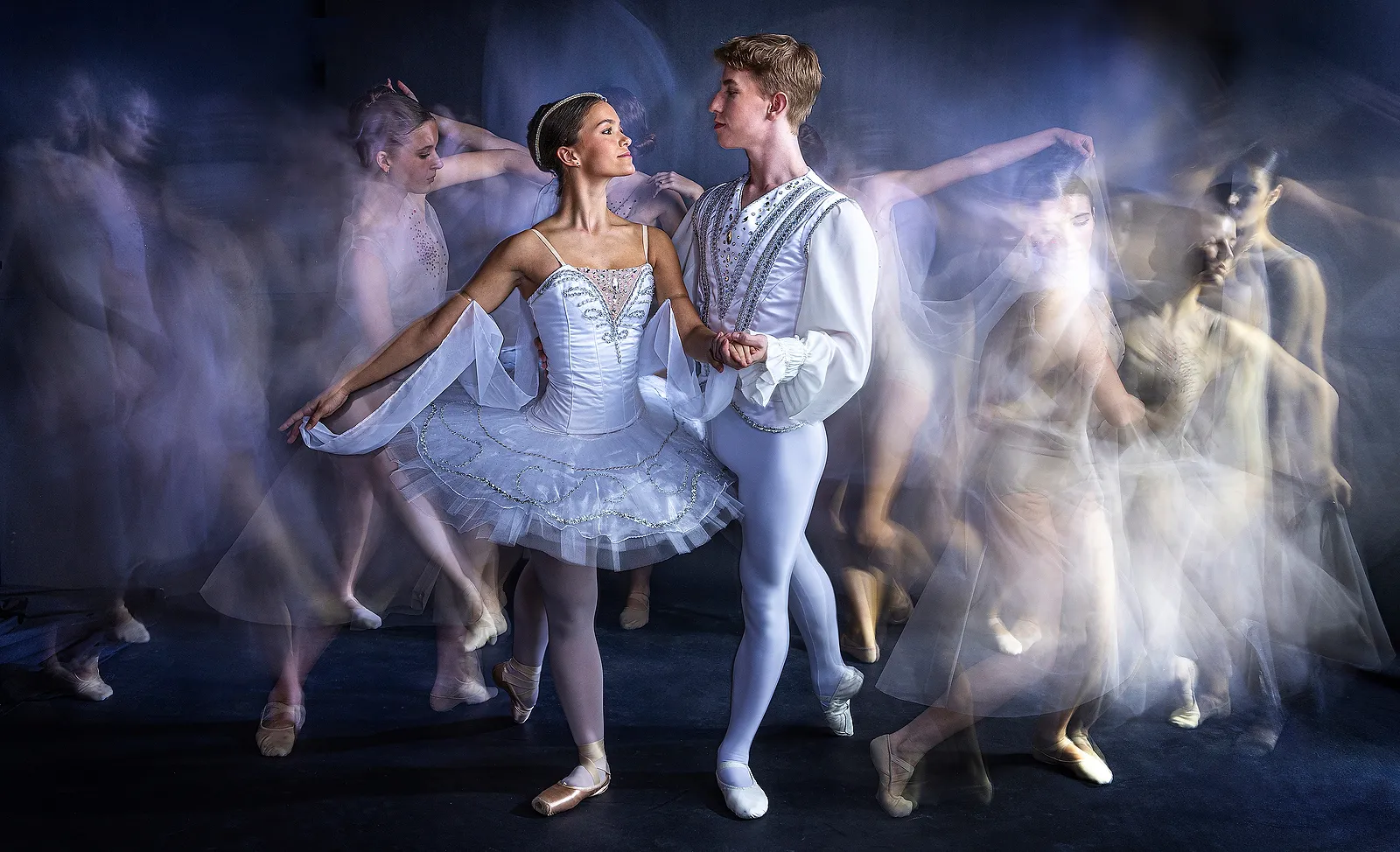 Members of the Repertory Ballet Ensemble pose for a marketing poster for their annual concert. The lead dancers hold the pose while cast members move around them.