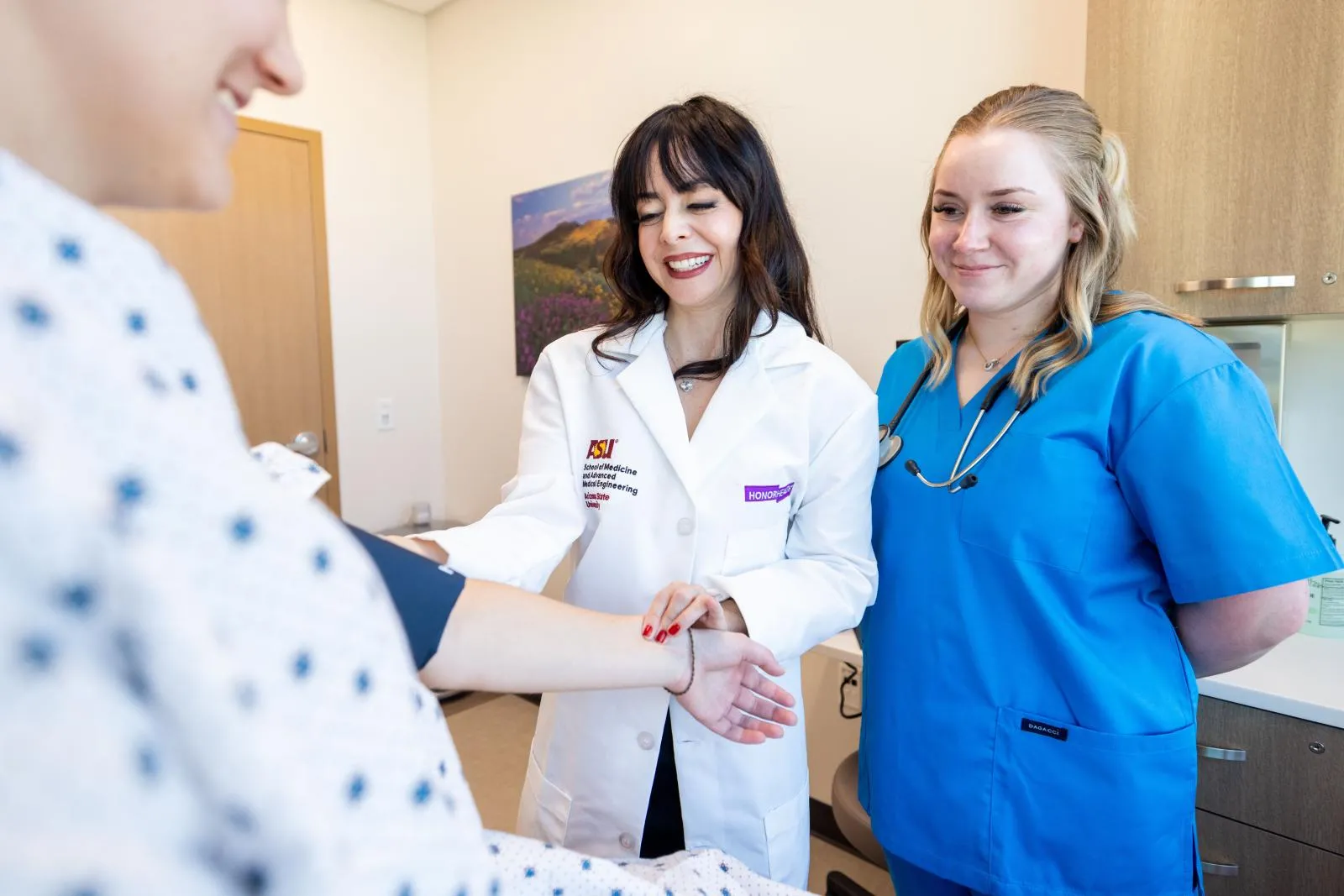Dr. Monica Torres (center), a physiatrist at HonorHealth, shows fourth-year biomedical sciences student Maddison Dyer (right) how to manually measure a patient’s heart rate at the Bob Bové Neuroscience Institute at HonorHealth in Scottsdale, Ariz., on Oct. 7, 2024.