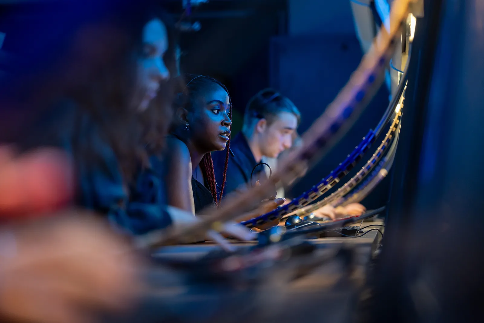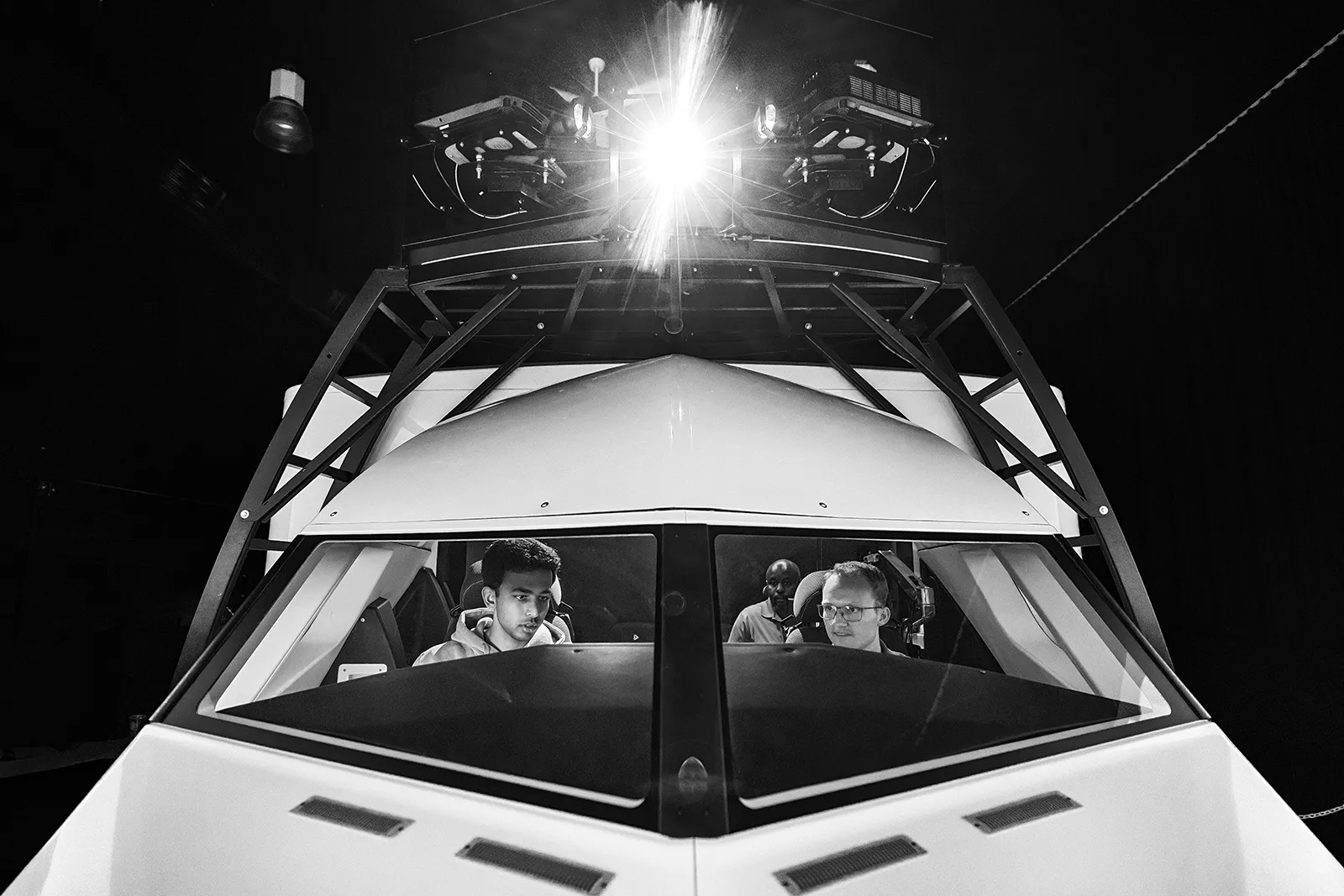 A student, a flight instructor, and a professor use an ALSIM flight simulator for an aviation training program.