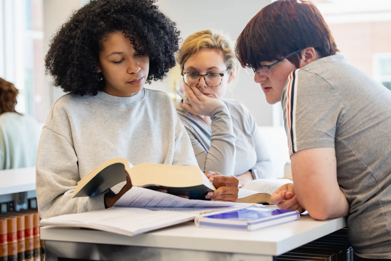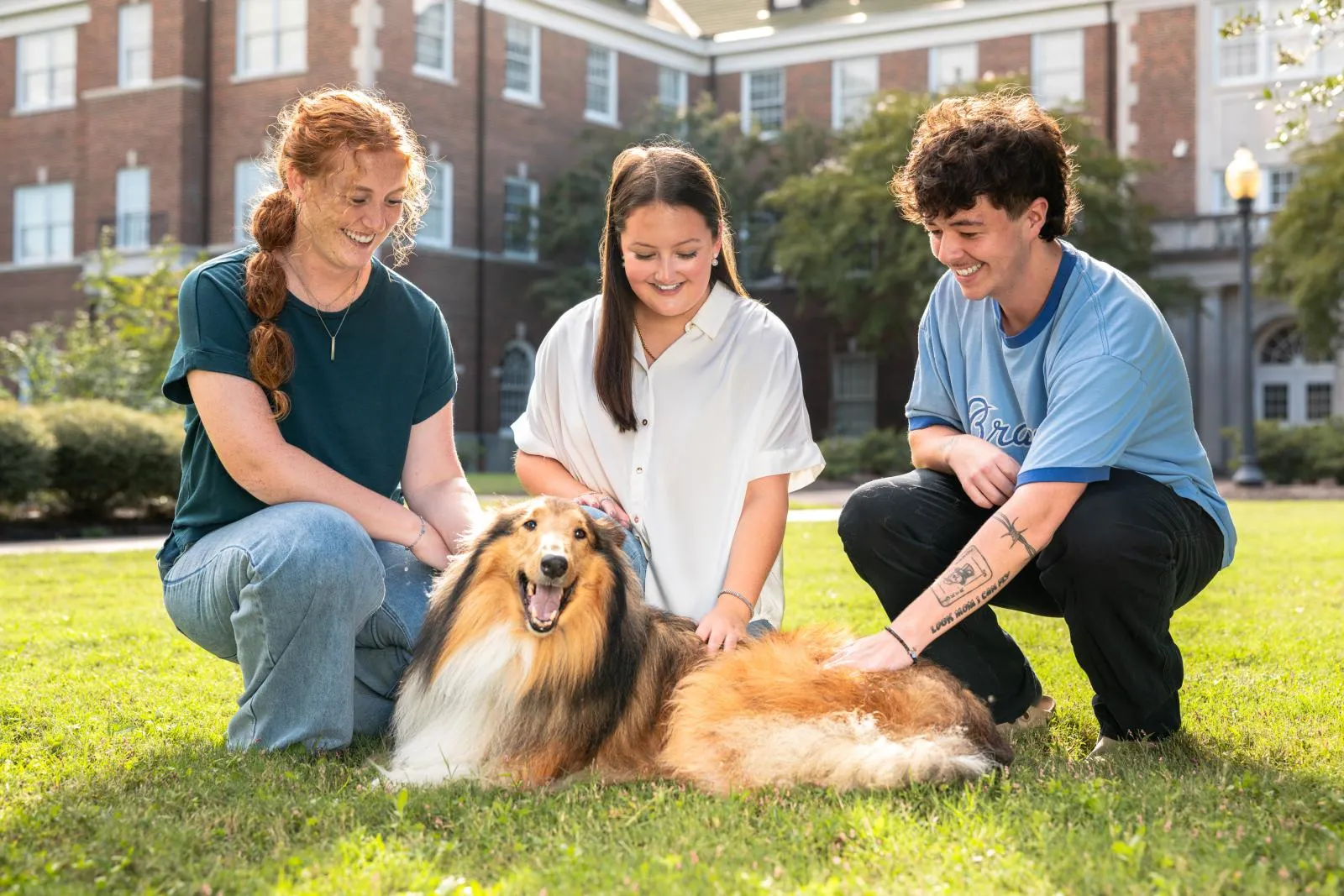 Students pet registered therapy dog Ollie the Collie in photoshoot for the university magazine.