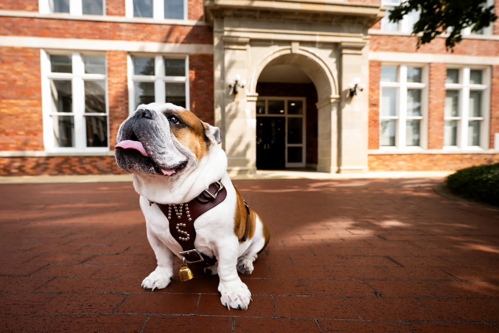 "Dak," MSU's live mascot, poses in front of McCain Hall during a promotional shoot for the Bagley College of Engineering.