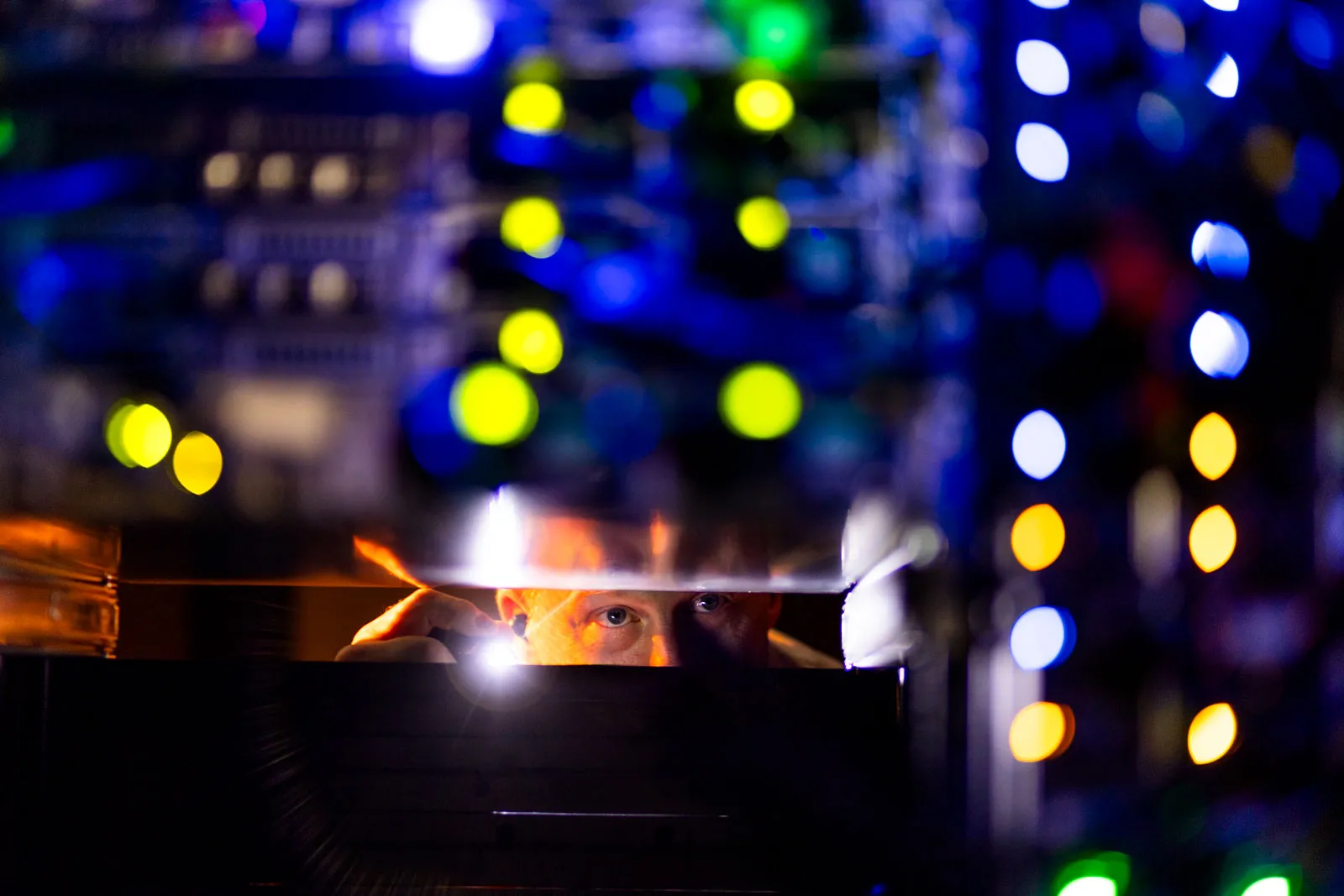 A staff member inspecting server racks for a story talking about computers maintaining sensitive information.