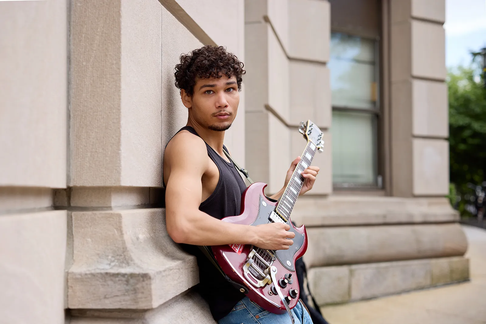 A guitar major at Berklee College of Music poses with his instrument for the new enrollment campaign.