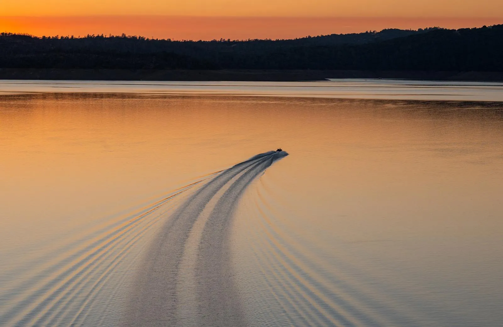 A boat takes a sunset cruise on Lake Oroville on Wednesday, August 28, 2024 in Oroville, Calif.