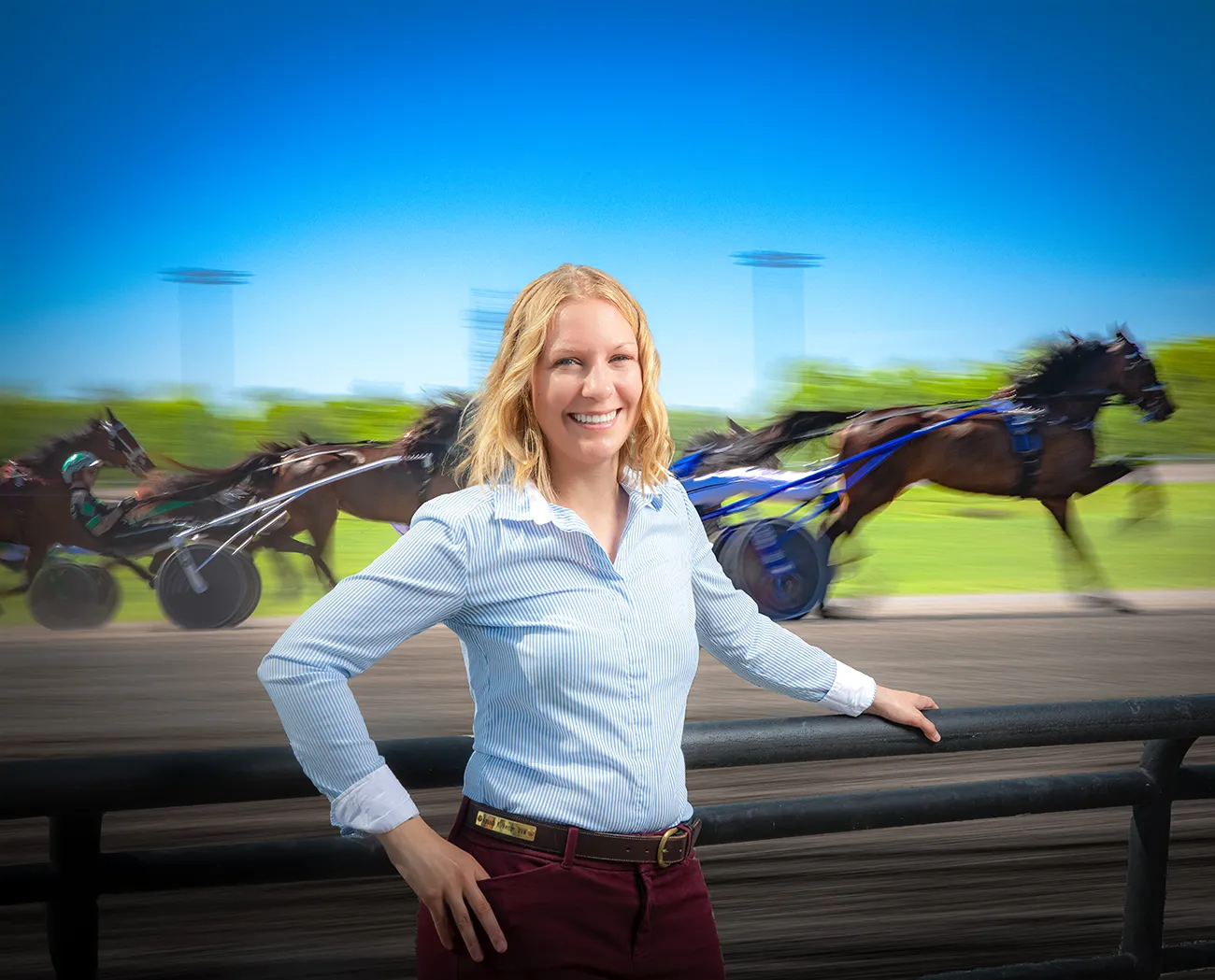 Portrait of a PhD candidate in Biomedical Sciences who researches sudden cardiac death in sport horses. We could not use the strobe that close to the horses so I shot the races with motion blur and then shot the subject lit with the strobe between races.