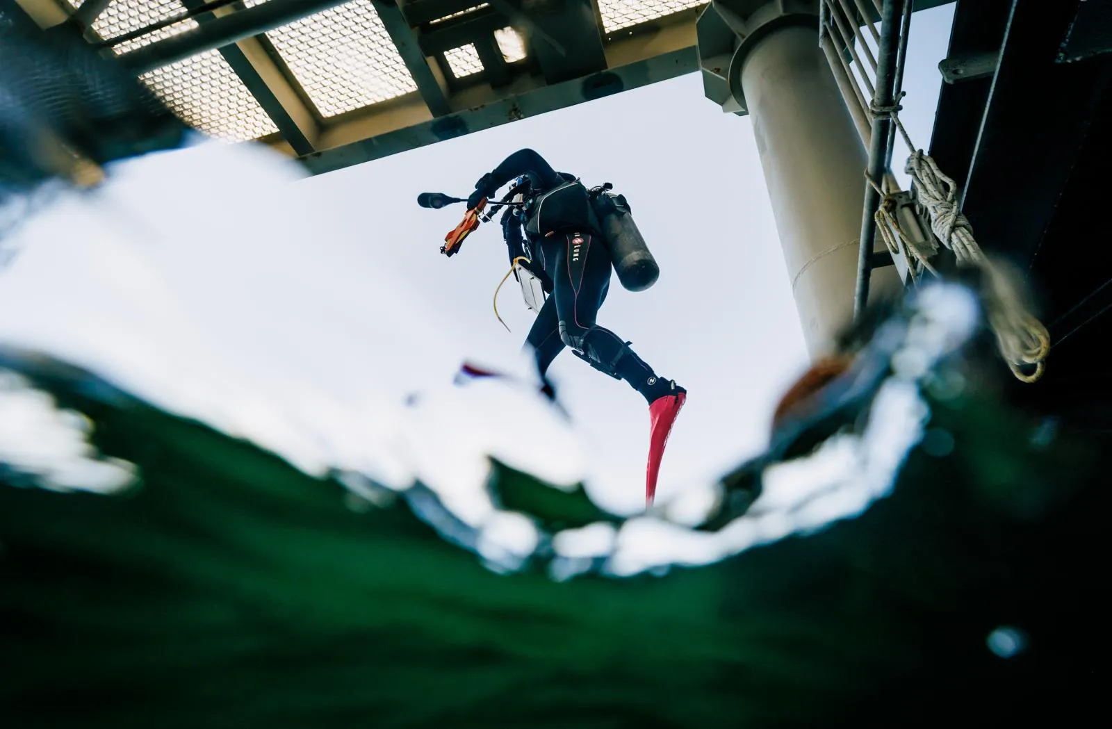 A student in the MSCI 410 Scientific Diving course leaps off the university's pier and into the water for the start of a diving exercise. Students in the summer course gain experience in collecting data and handling scientific equipment underwater.
