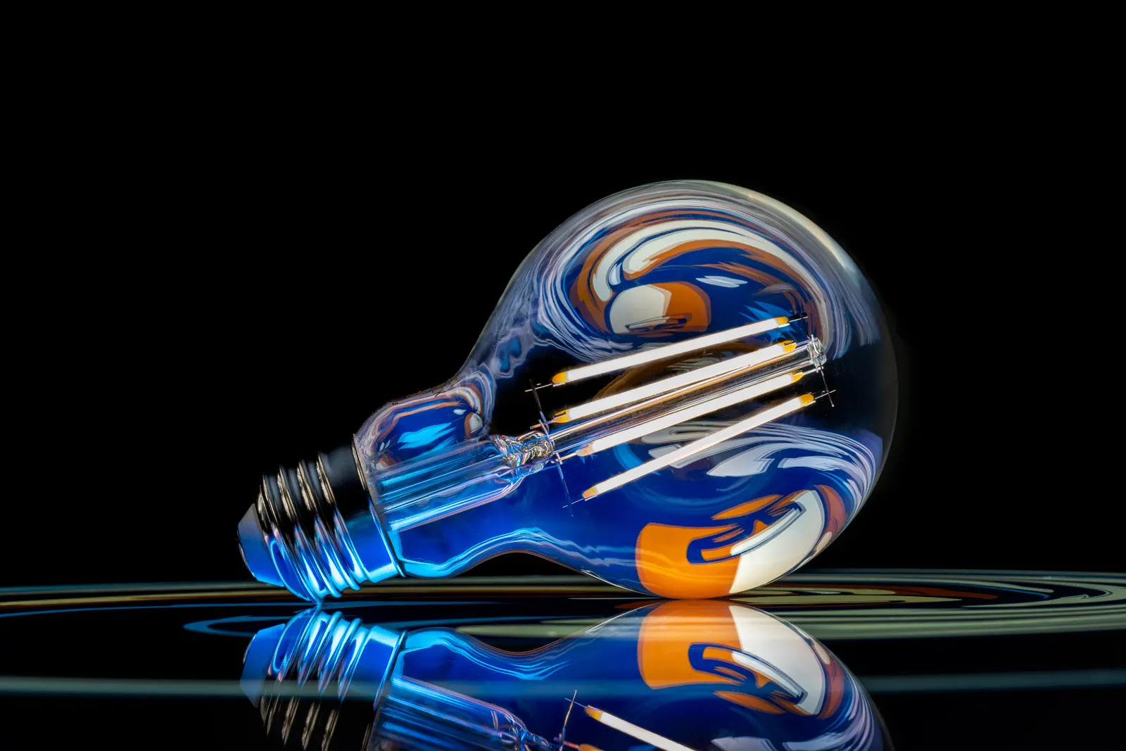 This is a composite image. It includes the original bulb photo with its reflection, a layer showing the filament turned on, and an additional layer of the screw base's top (light-painted to enhance visibility).