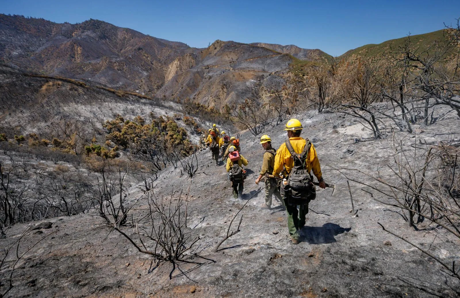 David Hershberger, a 4th year forestry and fire science student, glances back as he and the rest of Santa Lucia Crew 7 hike through the burn area of the Lake Fire. Crew 7 is a Type II U.S. Forest Service handcrew based in Los Padres National Forest. For the past 50 years, Santa Lucia Crew 7's ranks have included students from the university.