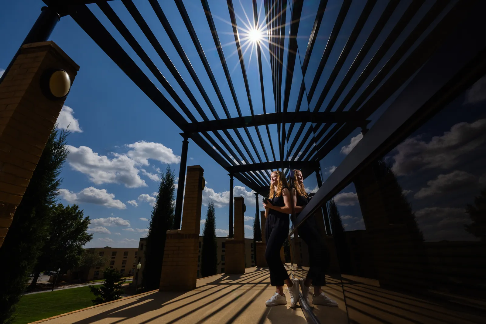 A student holding a camera at a visual part of campus to promote the photography program at the university.