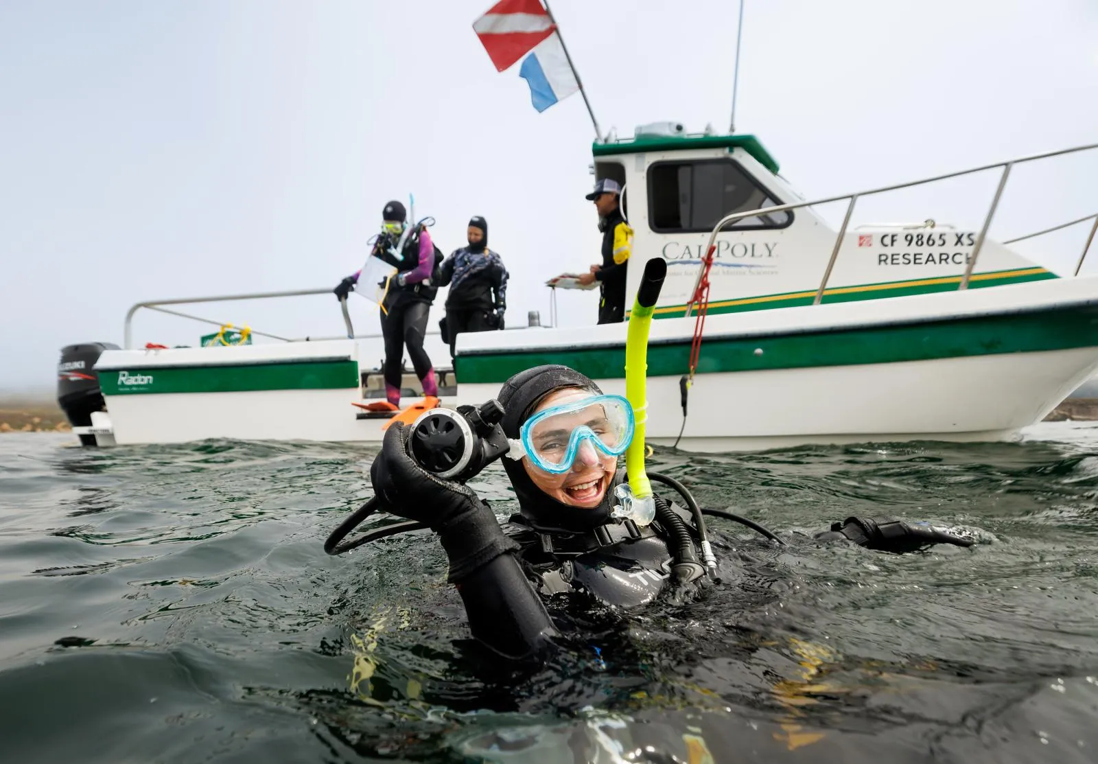 A student in the MSCI 410 Scientific Diving course prepares to dive in the waters off the Montaña de Oro coast. Students in the summer course