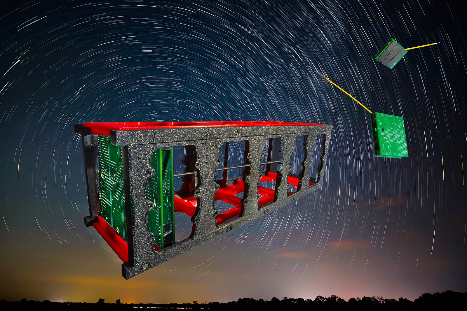 This composite is a visual vision of the housing and satellites that will be released in space with the cooperation of NASA. The star trail was shot at an outlying university property. The housing and the satellites were shot separately and added in PhotoShop. The assignment was to create a photo for advertisement, to be given to high school students and teachers about a program that high schoolers can build their own satellite to be released in space.