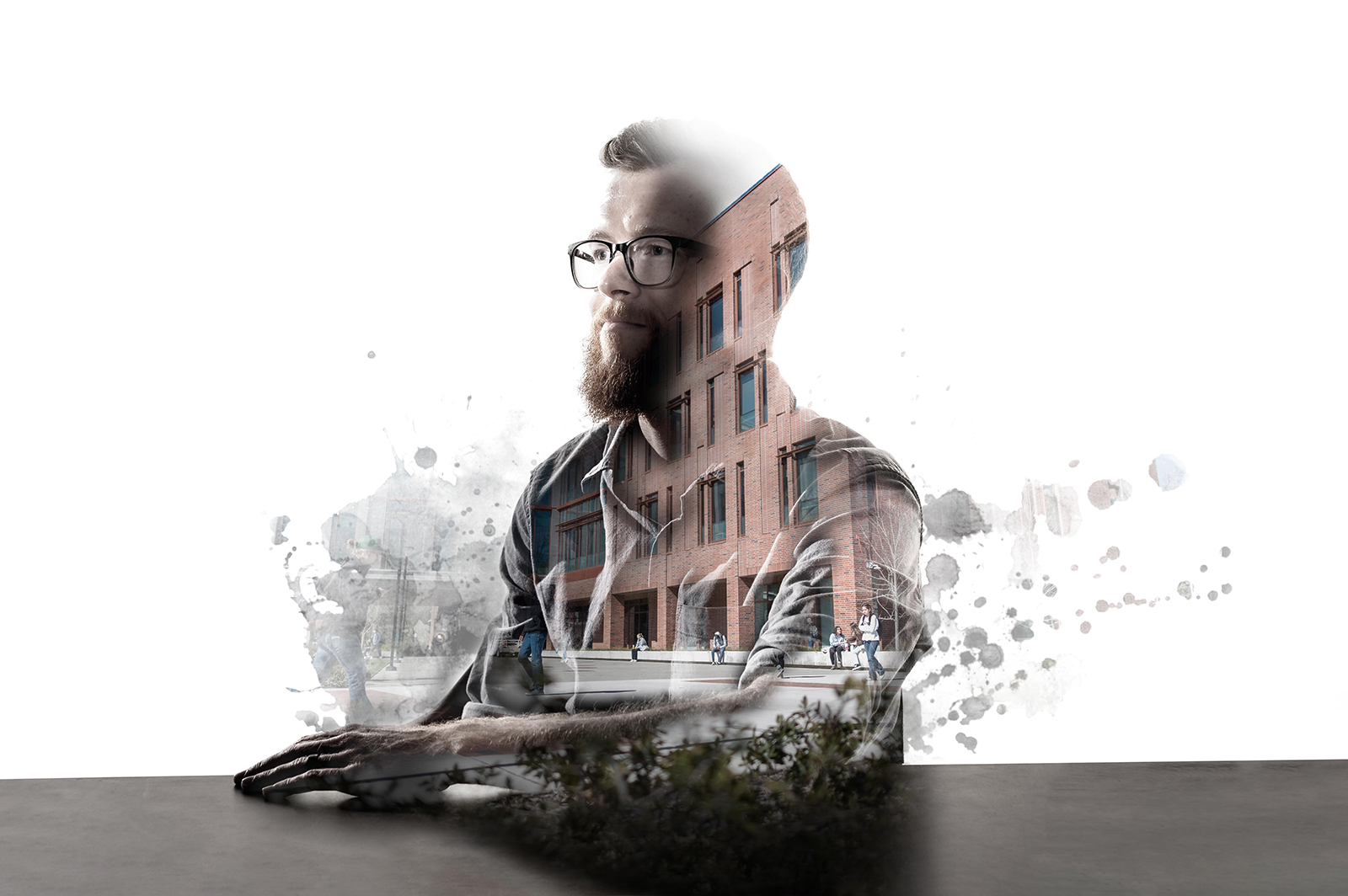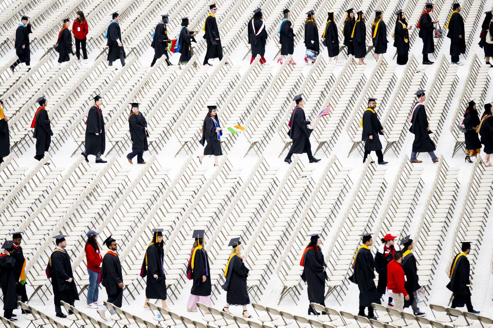 In camera double exposure of a happy graduate running mashed with out of focus graduates sitting in their chairs.