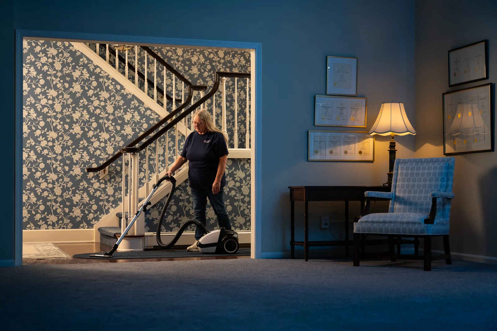 A custodian vacuuming the entryway of one of our campus houses. Part of a series highlighting staff across campus.