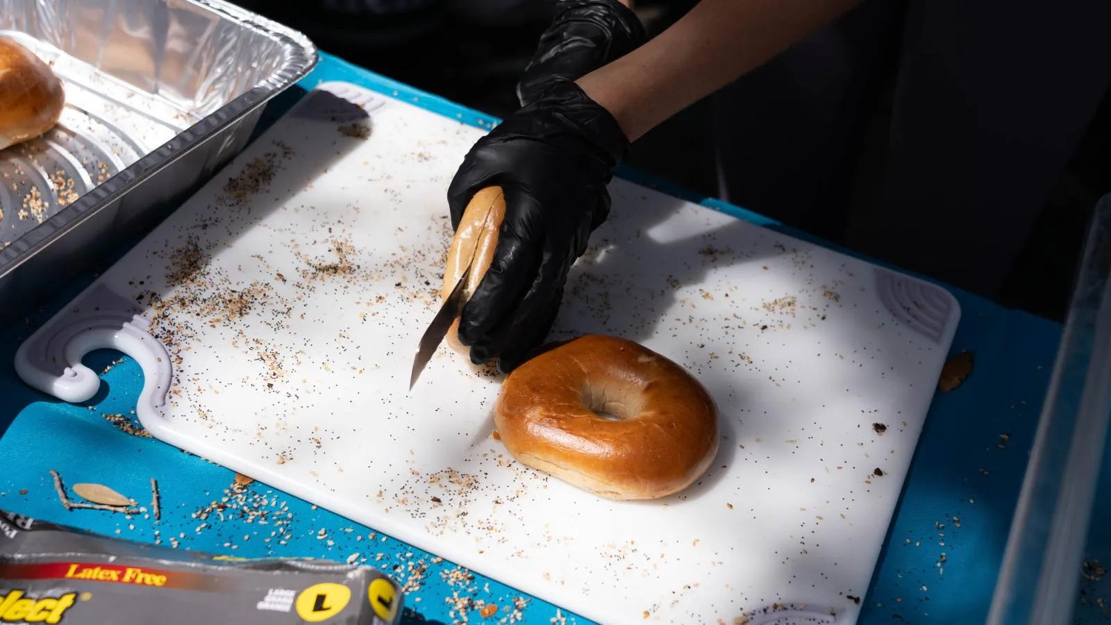 Coral Gables, FL--2024-02-28--Photo by Matthew Rembold/University of Miami--Gavin McKenna, a student at the University of Miami Herbert Business School, slices bagels for his "Barnyard Bagels Co." Food stand during the weekly Wednesday Farmer's market held at the University of Miami. McKenna started the bagel stand in collaboration with UM dining services and has freshly made bagels shipped overnight from New York to prep bagel sandwiches of all varieties for sale at his stand every Wednesday.