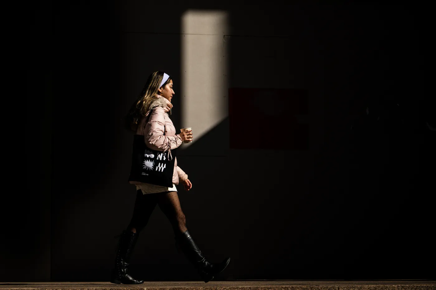 A student catches a spot of sunshine as she walks to the library on Monday, Feb. 5, 2024.