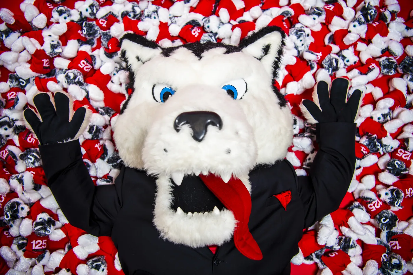 University mascot paws lays on a pile of stuffed husky dolls during a studio photoshoot in Boston on Wednesday, Feb. 14, 2024.