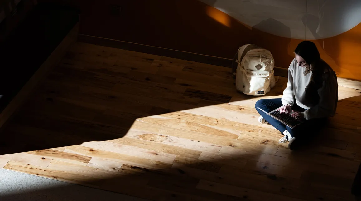 Student studying while a streak of light hits her.
