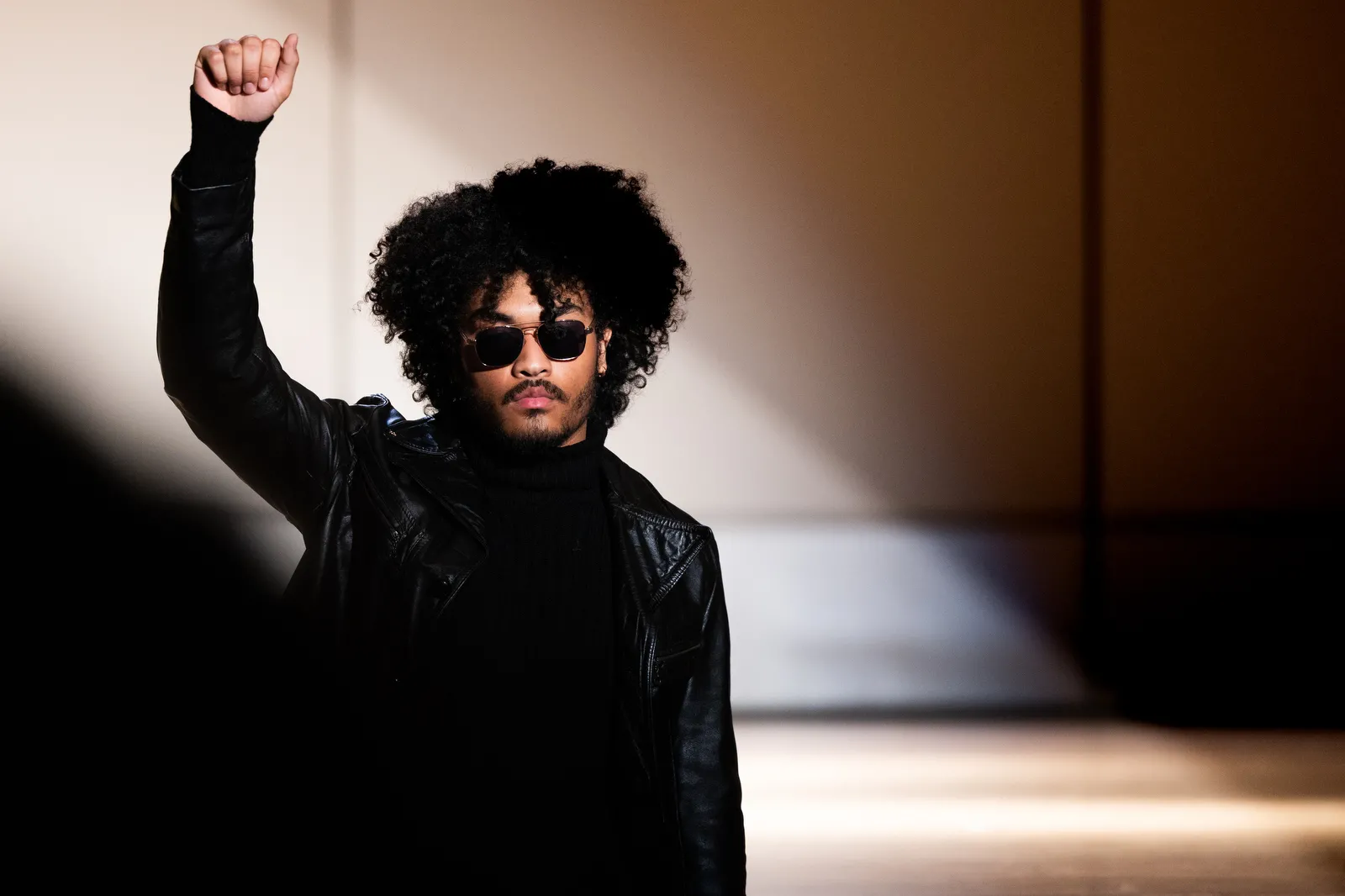 A student raises his fist at a cultural fashion show in honor of Black History Month.