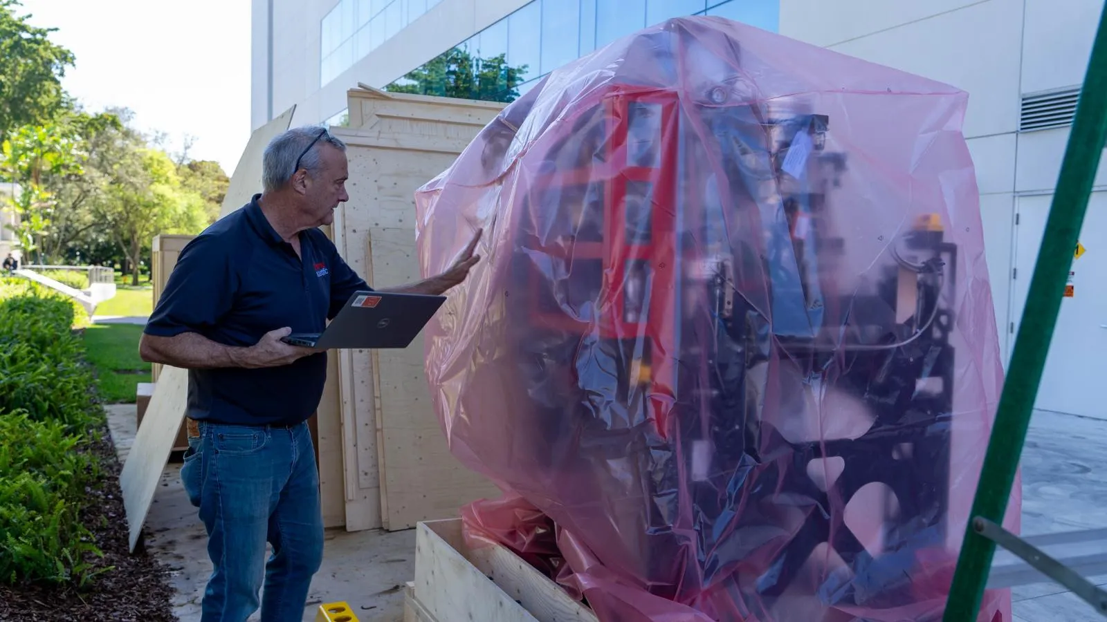 Coral Gables, FL--2024-02-21--Photo by Matthew Rembold/University of Miami--A component of a Talos 200 Microscope is examined before being delivered to the Frost Institute of Chemistry and Molecular Sciences on Tuesday.