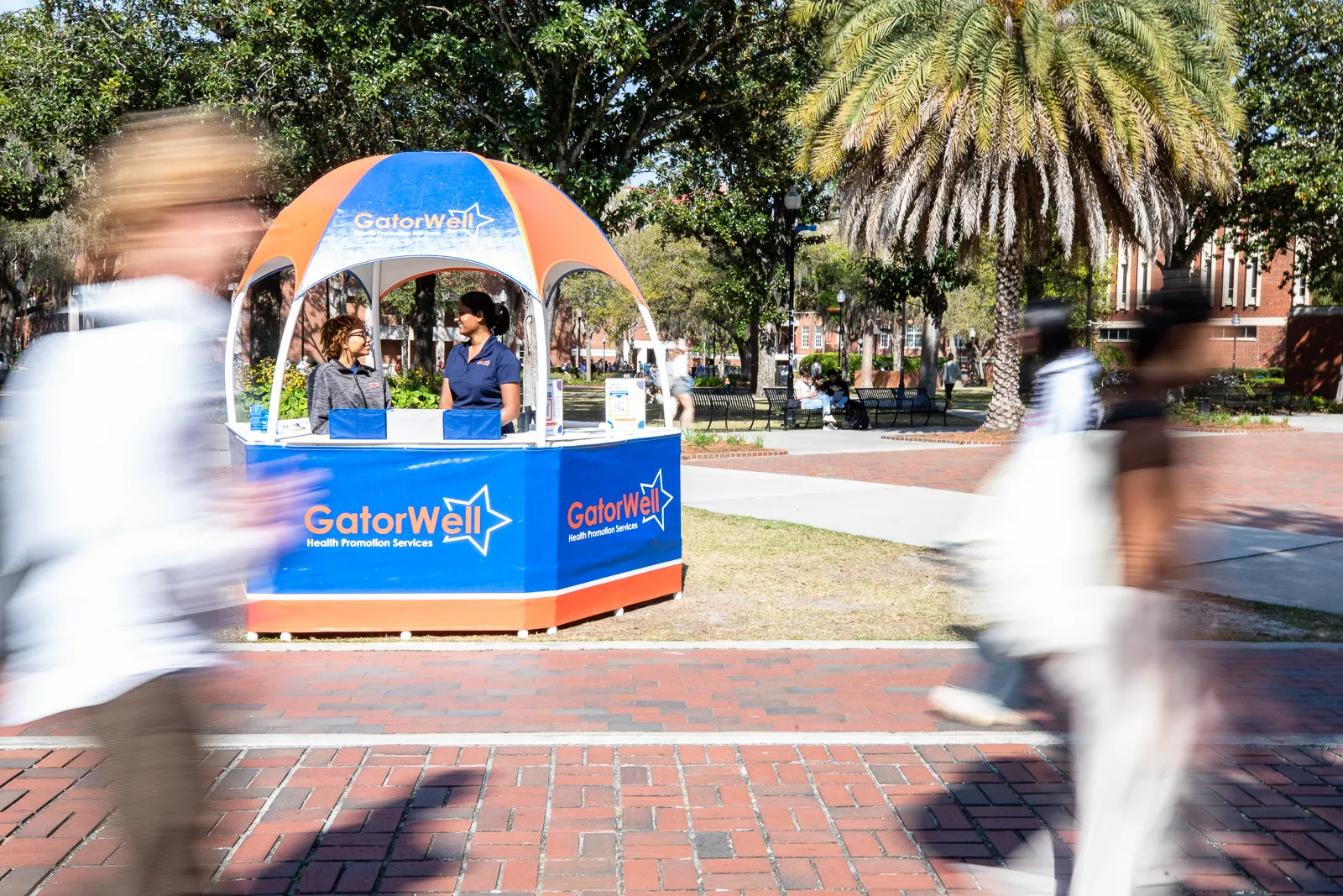 Students walk past the GatorWell Health Hut on Thursday, February 29, 2024.