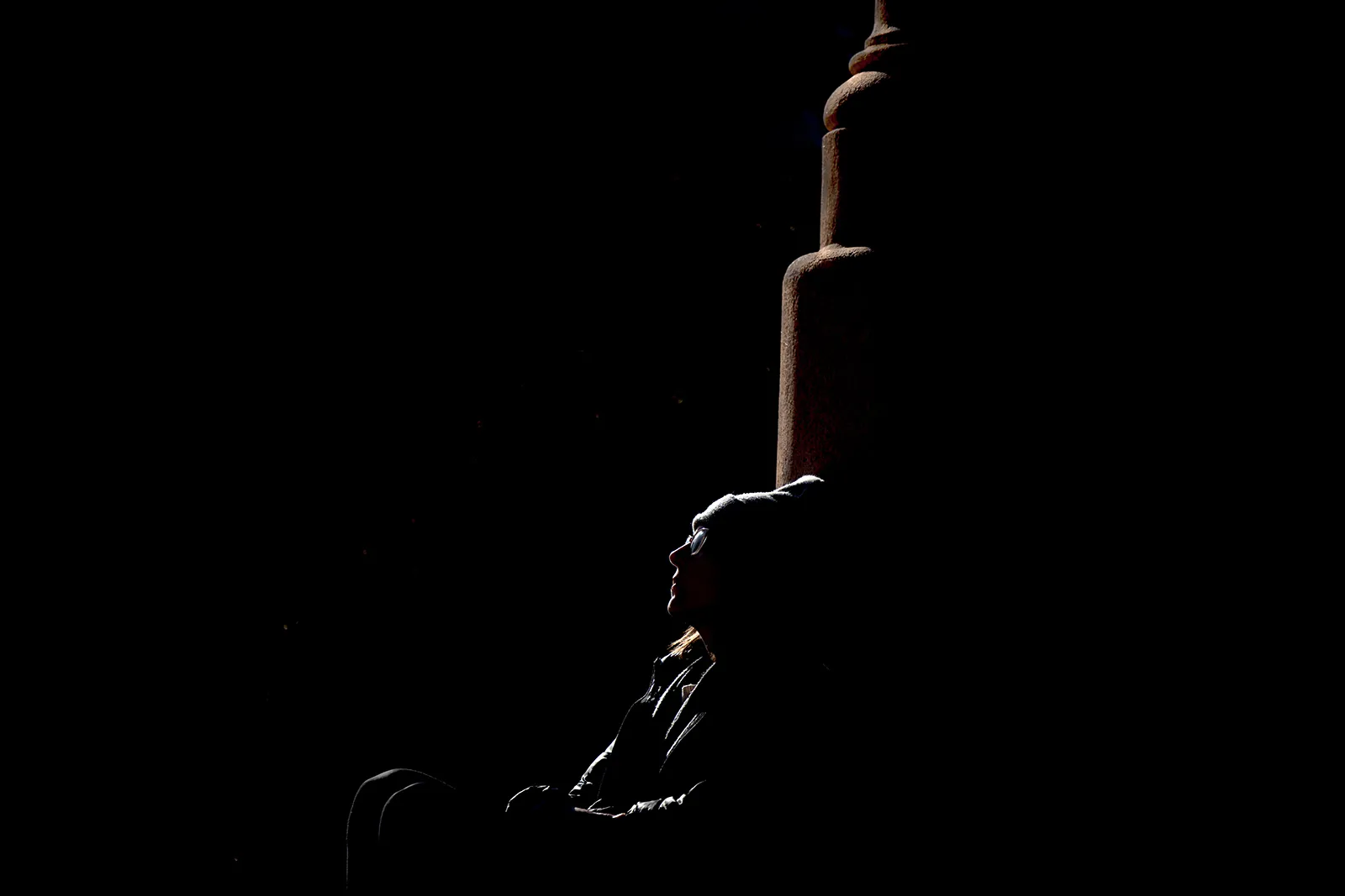 A student is outlined by the afternoon sun as she rests against a pillar outside of the Samuel Cupples House on February 6, 2024.